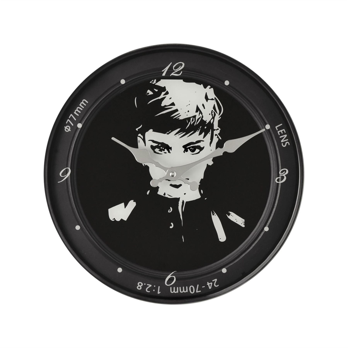 The camera lens clock design places the female actress at centre stage with a delightful, black and white printed image. The Arabic quarter dial features complementary numbering and is finished with silver spade clock hands.