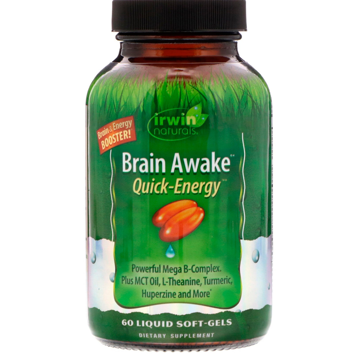 Brain & Energy Booster! Dietary Supplement Powerful mega-b complex. Plus MCT oils, l-theanine, turmeric, huperzine and more. Brain Wake Quick-Energy delivers a quick energy boost in addition to advanced brain-supporting ingredients that can help maximize thinking power and mental performance. Energy Boost: MCT Oil helps deliver a quick-boost of cellular energy for your mind and body. Also Yerba Mate extract supplies an additional energy boost with caffeine to help you feel energized. Mega B-Complex delivers B Vitamins which are essential for the body to produce energy. Brain Support: Ginkgo extract is included for its ability to support cognitive function and memory in healthy individuals while supporting blood flow to the brain. L-Theanine plus caffeine help to promote attention and alertness, thereby supporting mental performance. Clubmoss extract delivers Huperzine - A for additional nutritional support. Brain Awake Quick-Energy is ideal for active students, parents, and working professional, but is also suitable for anyone seeking to optimize brain function and performance while gaining a quick energy advantage. What makes us different: Liquid Soft-Gels - The nutrients in these easy-to-swallow Liquid Soft-Gels are released fast. Other forms of delivery can contain binder and fillers that may cause stomach upset and offer no nutritional value. Advanced Liquid Soft-Gels provide an optimum delivery system. Quality Assurance - Irwin Naturals is committed to providing the highest quality products for health. We employ compliance testing to ensure purity and potency. Patented BioPerine - Our special BioPerine Complex enhances the bioavailability absorption and potency of many nutrients.