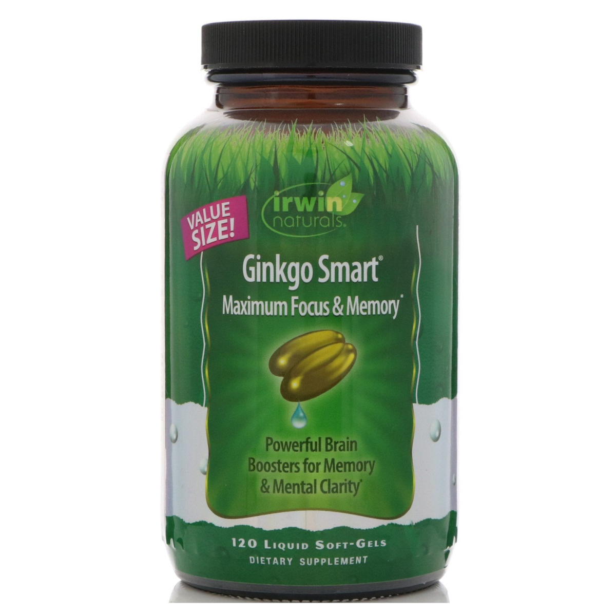 Value Size! Powerful Brain Boosters for Memory & Mental Clarity Dietary Supplement No Preservatives Added Ginkgo Smart Maximum Focus & Memory is specially formulated to help you maintain your mental edge. This multi-faceted product delivers powerful brain-boosting nutrients to keep your mind sharp and your memory at its best. Enhanced Memory: Ginkgo Biloba is one of the very best botanicals for the brain. Studies show that Ginkgo extracts can enhance blood flow to the brain, improve cognitive function and enhance memory. The Ginkgo extract used in this formula is standardized to contain 24% flavone glycosides and 6% terpene lactones for optimum for optimum potency. Neurotransmitter Support: Acetyl-L-Carnitine, Choline and DMAE are key precursors to acetylcholine (a brain chemical involved in memory and cognition). Velvet Bean extract is a plant source of L-Dopa (which is unique in its ability to cross the blood-brain barrier and convert into Dopamine). Antioxidant Protection: Alpha-Lipoic Acid possesses antioxidant qualities that help protect neurons from oxidative stress. Ginkgo extract is also known to be an excellent free-radical scavenger in the body. Irwin Naturals "Ginkgo Smart" includes the emerging brain nutrient Huperzine. Plus this advanced formula supplies healthy levels of Omega-3 Fatty Acids from Fish Oil. The ingredients in this comprehensive formula support overall cognitive health. What makes us different: Liquid Soft-Gels - The nutrients in these easy-to-swallow Liquid Soft-Gels are released fast. Other forms of delivery can contain binders and fillers that may cause stomach upset and offer no nutritional value. Advanced Liquid Soft-Gels provide an optimum delivery system. Quality Assurance - Irwin Naturals is committed to providing the highest quality product for your health. We employ compliance testing to ensure purity and potency. Patented BioPerine - BioPerine enhances the bioavailability, absorption and potency of many nutrients.