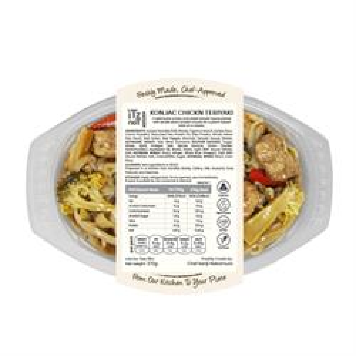 Konjac Chick'n Teriyaki made with fresh ingredients and steam cooked using Swedish technology, contains no artificial ingredients yet offers up to 60 day shelf life from production. A patented valve on the film will whistle (just like a pressure cooker) indicating the meal has cooked evenly, even around the edges.
