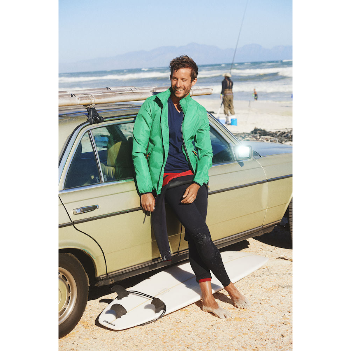 This windbreaker jacket is made from polyester and is naturally showerproof. The jacket packs away into one of the front pockets and can then be carried with a handle.