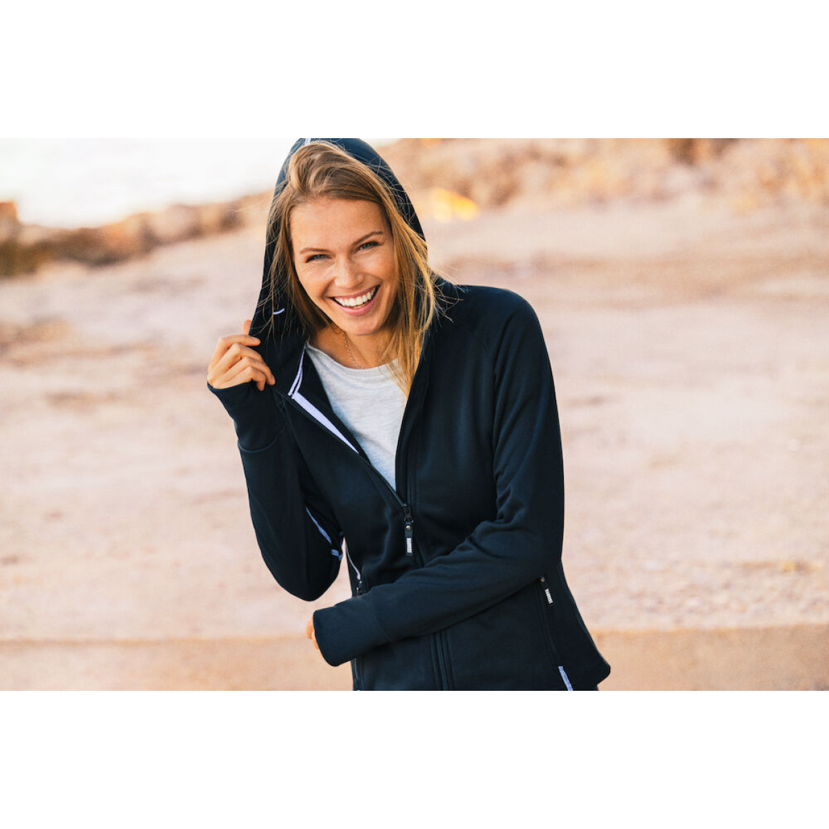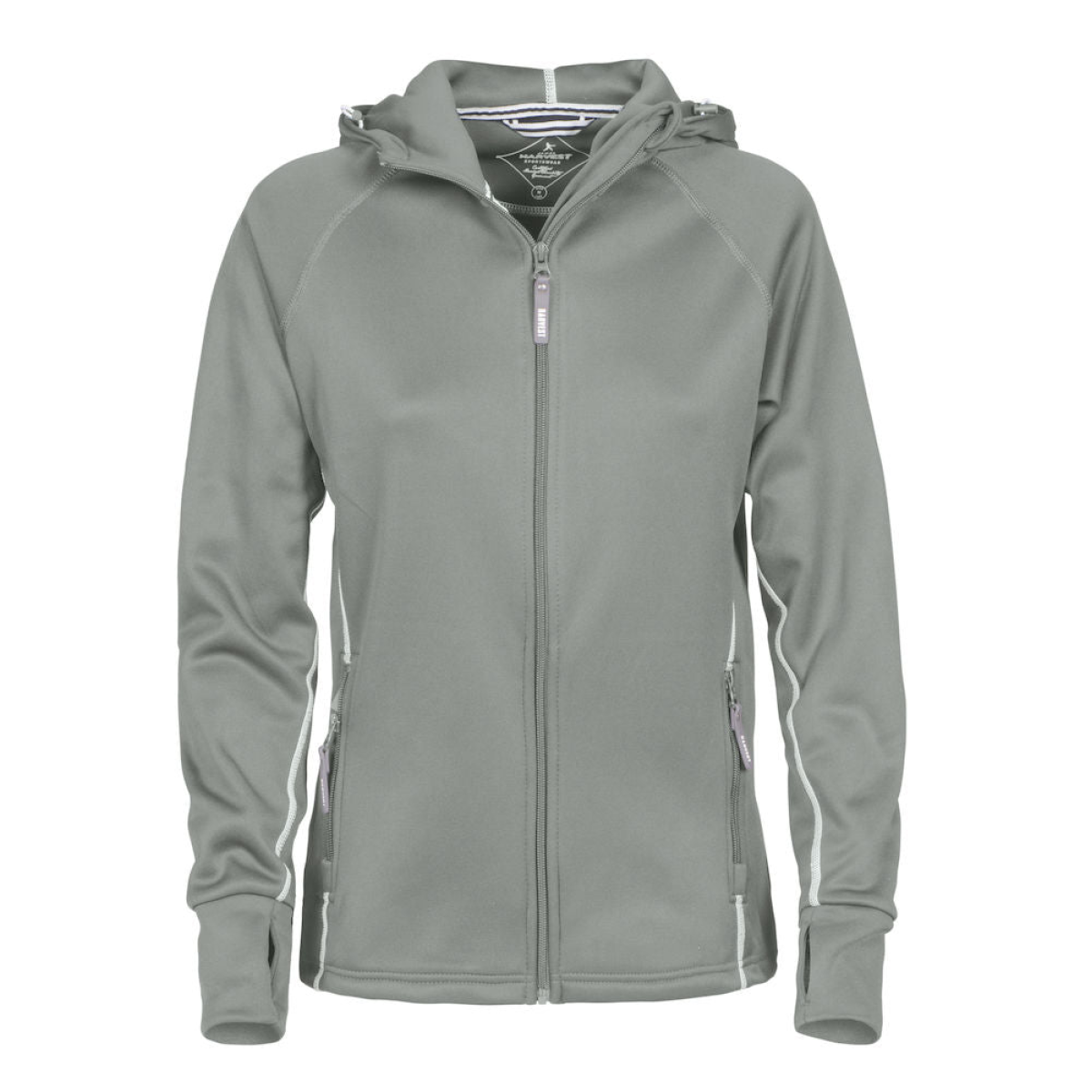 The contrasting flat lock seams and high front collar give this hooded fleece jacket a sporty look.