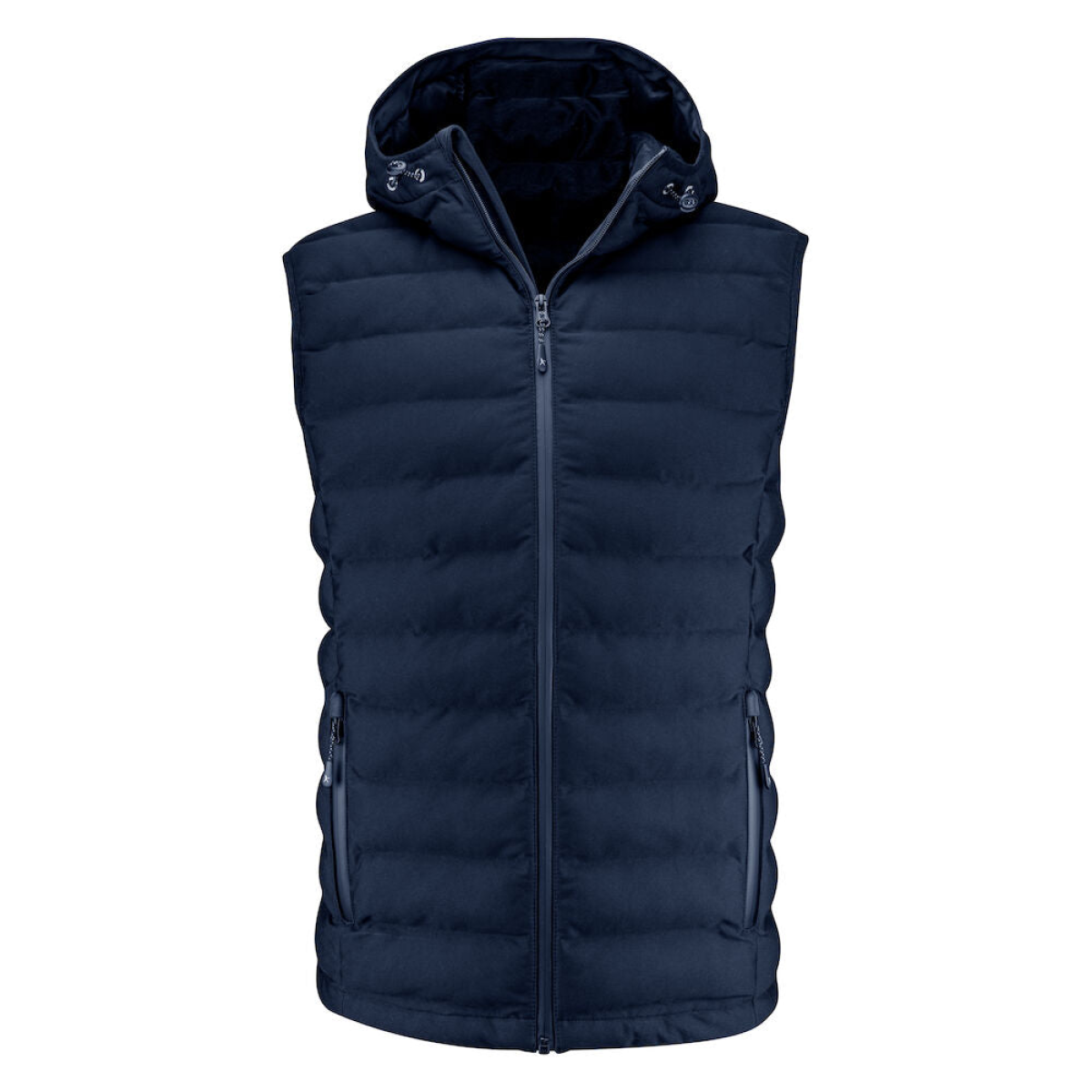 The hood is cord-adjustable with toggles, and the gilet is finished with elastic tape at the seams.