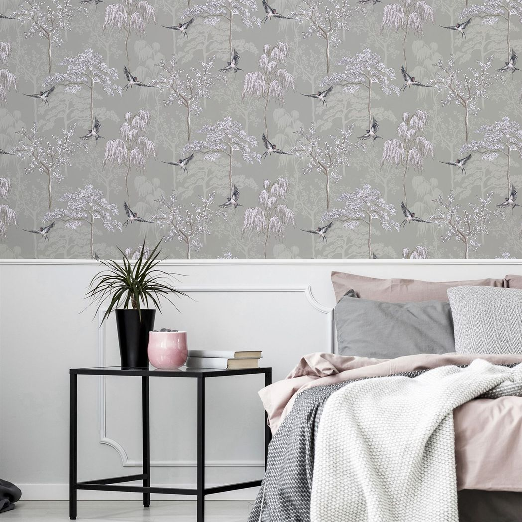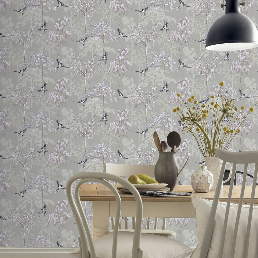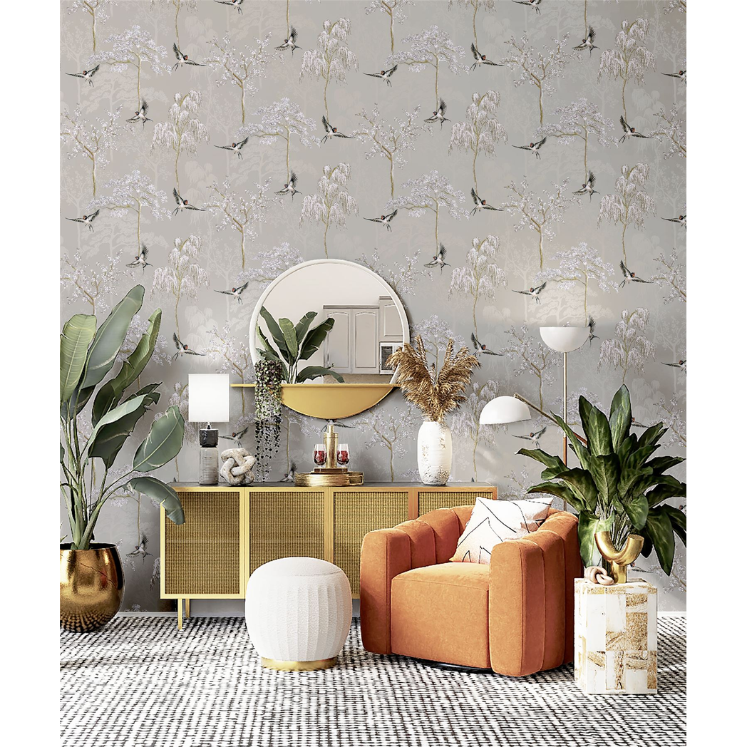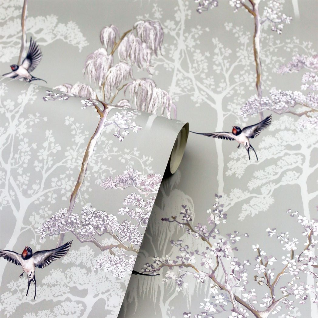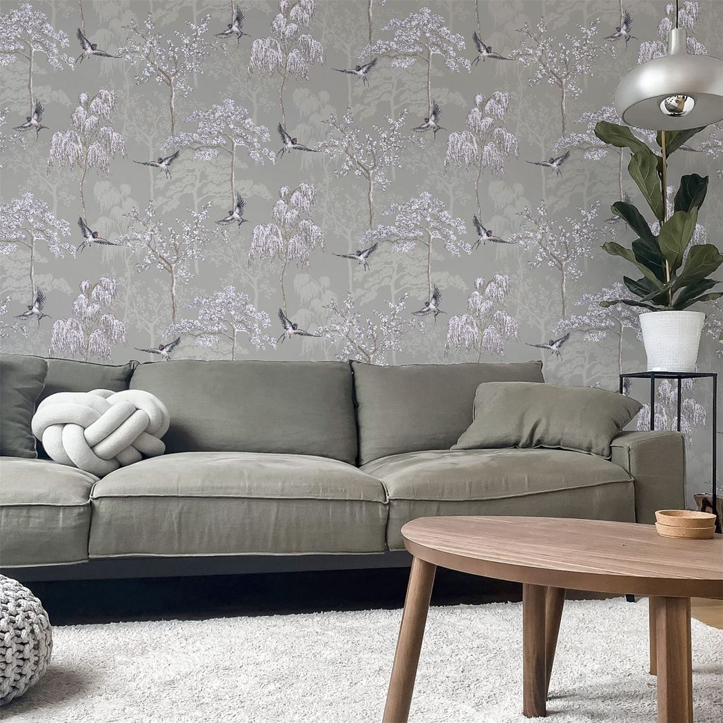 This eye-catching and stylish wallpaper design is filled with beautifully hand drawn oriental trees and birds on a soft grey coloured background. The hand drawn pattern is enhanced with pearlescent highlights that adds interest and texture to the design. This wallpaper is the perfect choice for a feature wall in a living room, a bedroom, or a hallway.