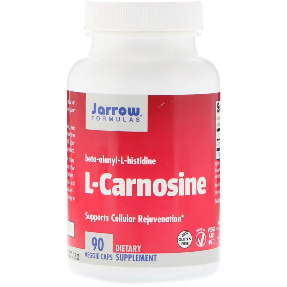 Gluten Free Vegan Veggie Caps Supports Cellular Rejuvenation Dietary Supplement L-Carnosine is a dipeptide that is found in the brain, heart, skin, muscles, kidneys and stomach that supports healthy aging and cellular rejuvenation. L-Carnosine optimizes healthy cell function and promotes anti-aging by neutralizing free radicals thereby functioning as an antioxidant, including in brain and nerve cells.