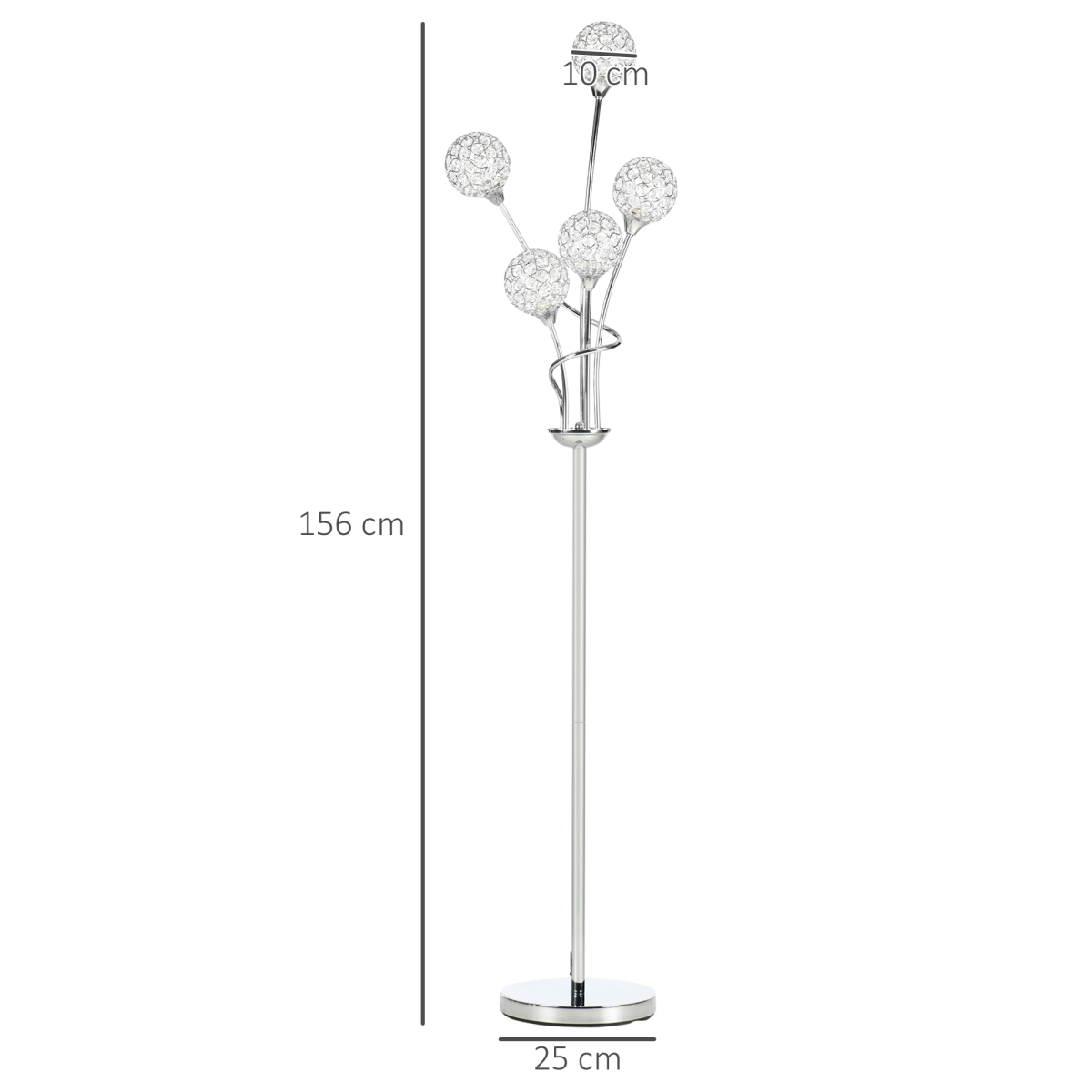 Five crystallite shades: A beautiful, sparkling upright floor lamp. Rounded shades, filled with beads which glisten when the lights are on.Metal frame: A strong and sturdy core for this tall lamp. Rounded base for balance.Foot switch: Easy to turn this standing lamp on and off - without even having to use hands. Long power cable to stretch across longer distances.Five bulbs required, not included: Living room lamp takes G9 bulbs, maximum 25W. Halogen and LED are suitable.Dimensions: 156H x 34W x 25Dcm. Easy to assemble.
