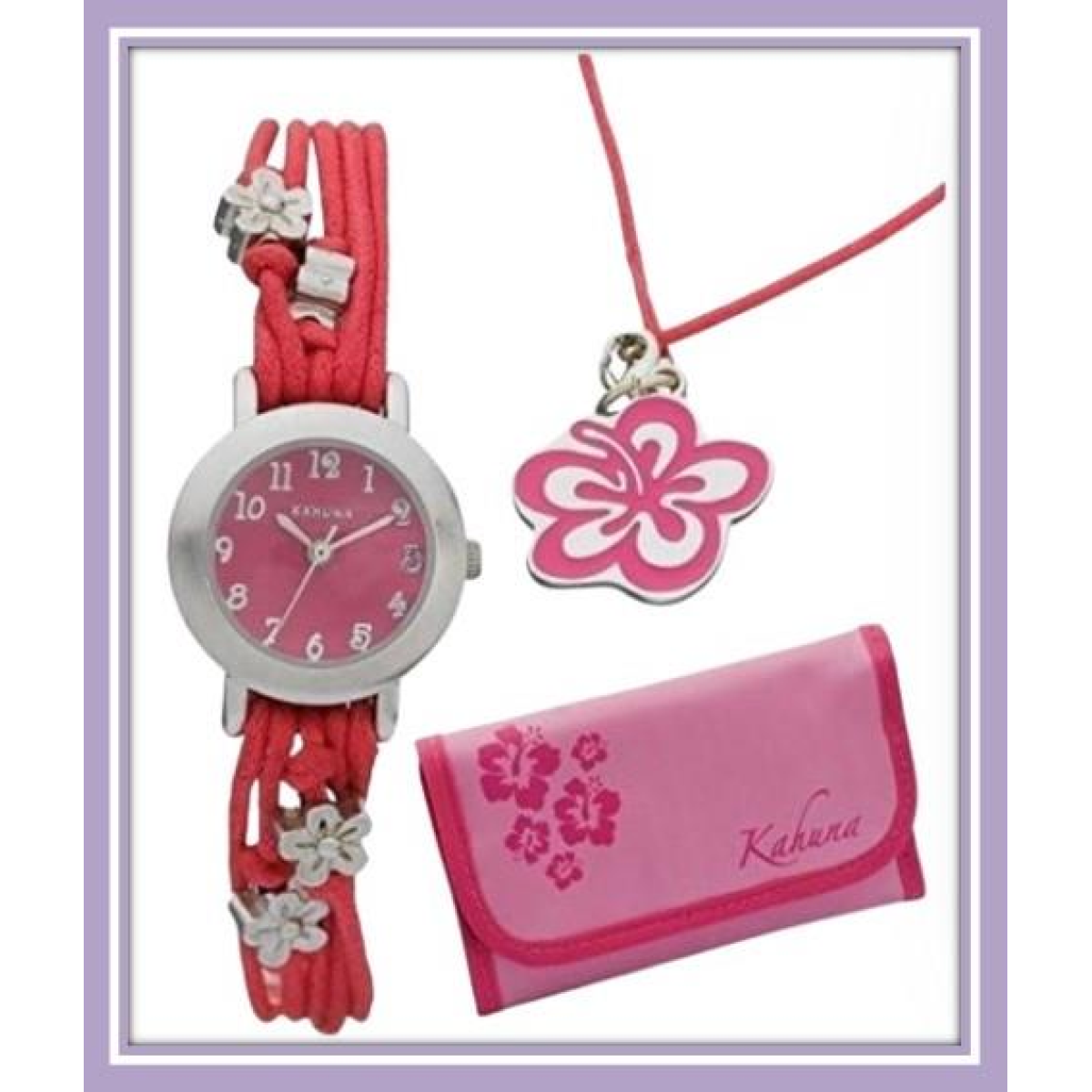 This Girls Kahuna Wallet Gift Set watch is made from stainless steel and is powered by a quartz movement. It fastens a red material strap and has a pink dial. SPECIFICATIONS Brand : Kahuna Packaging : Kahuna packaging Guarantee : Kahuna 2 year guarantee Case
