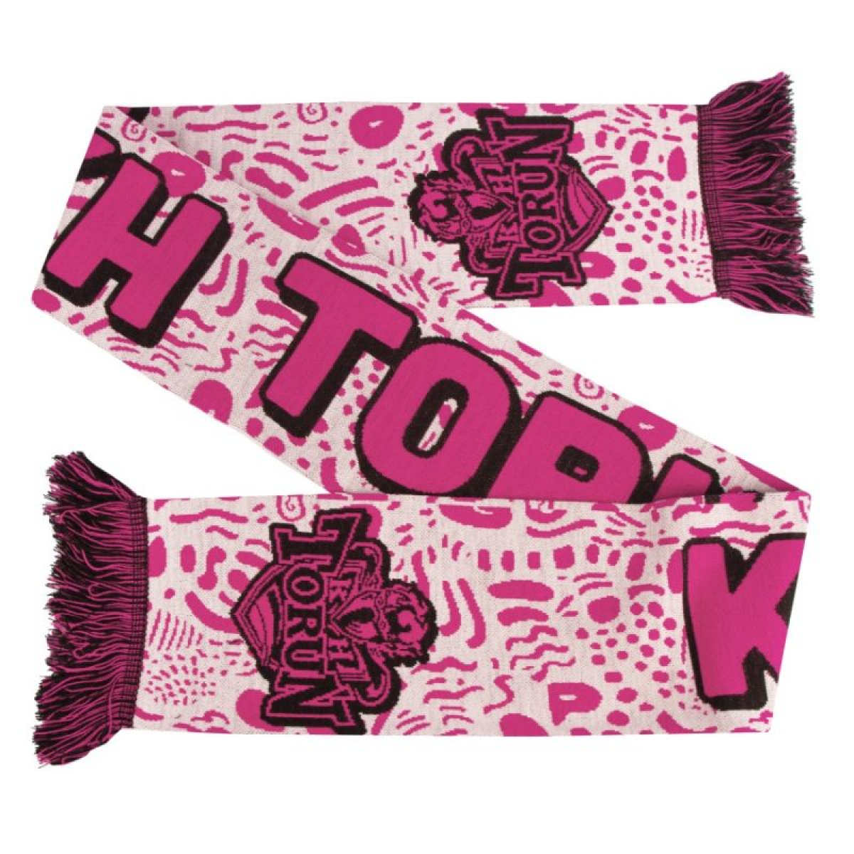 KH Toruń PINK Scarf. Stand out in the stands with the club's bold colors. The KH Toruń PINK scarf is a unique option for fans who like to stand out from the crowd and emphasize their loyalty to the club in a modern way. The intense pink color combined with contrasting details and a large "KH TORUŃ" lettering makes the scarf instantly eye-catching. The dynamic, sports-inspired pattern adds character, while the soft material ensures comfort on cooler days. Key features: Unique color scheme: The bold pink design allows you to stand out from the crowd and adds a fresh touch to your fan style. Large club lettering: The legible "KH TORUŃ" clearly emphasizes your loyalty to the team. Modern design: Graphic details give the scarf an energetic, sporty look. Soft-touch material: Provides warmth and comfort both during matches and everyday wear. The KH Toruń PINK scarf is a stylish and distinctive accessory that will perfectly complement any true fan's collection.