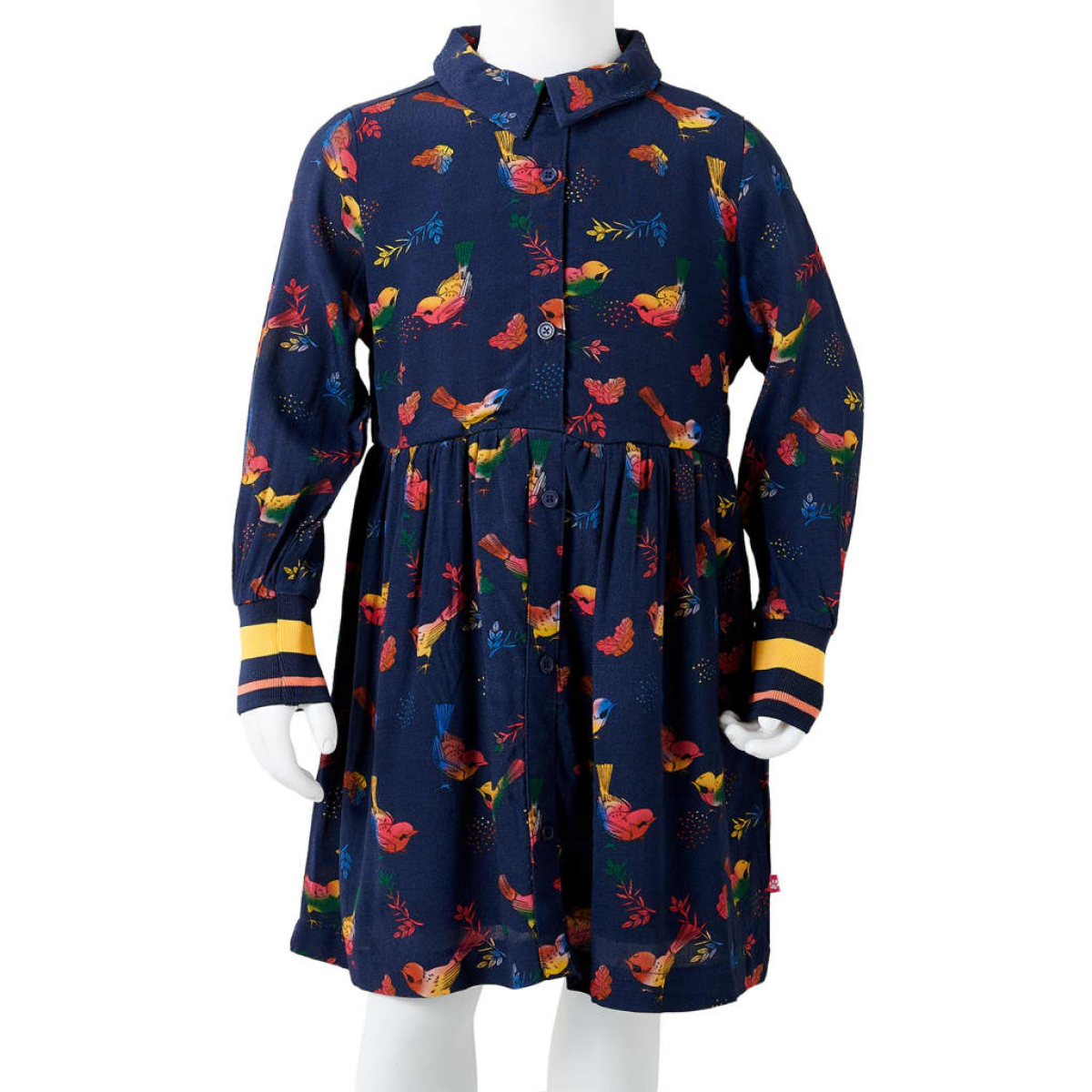 Our children's clothing line is all about affordable, high-quality, and durable everyday wear for kids aged 1.5 to 10. Our range includes jackets, sweaters, shirts, and many more, with a variety in style, size, and colour. Following the high-quality standard in the market, we are using high-grade materials and advanced manufacturing techniques. This kids' dress has long sleeves, a turn-down collar, and closes with front buttons. The children's dress is printed with colourful birds all over. This collared dress is made from soft material that includes viscose and polyester for comfort and breathability. Good to know: The size chart in the picture provides measurements for kids aged 1.5 to 10, covering the height, chest, waist, and hip. You can easily find the right fit for your child.