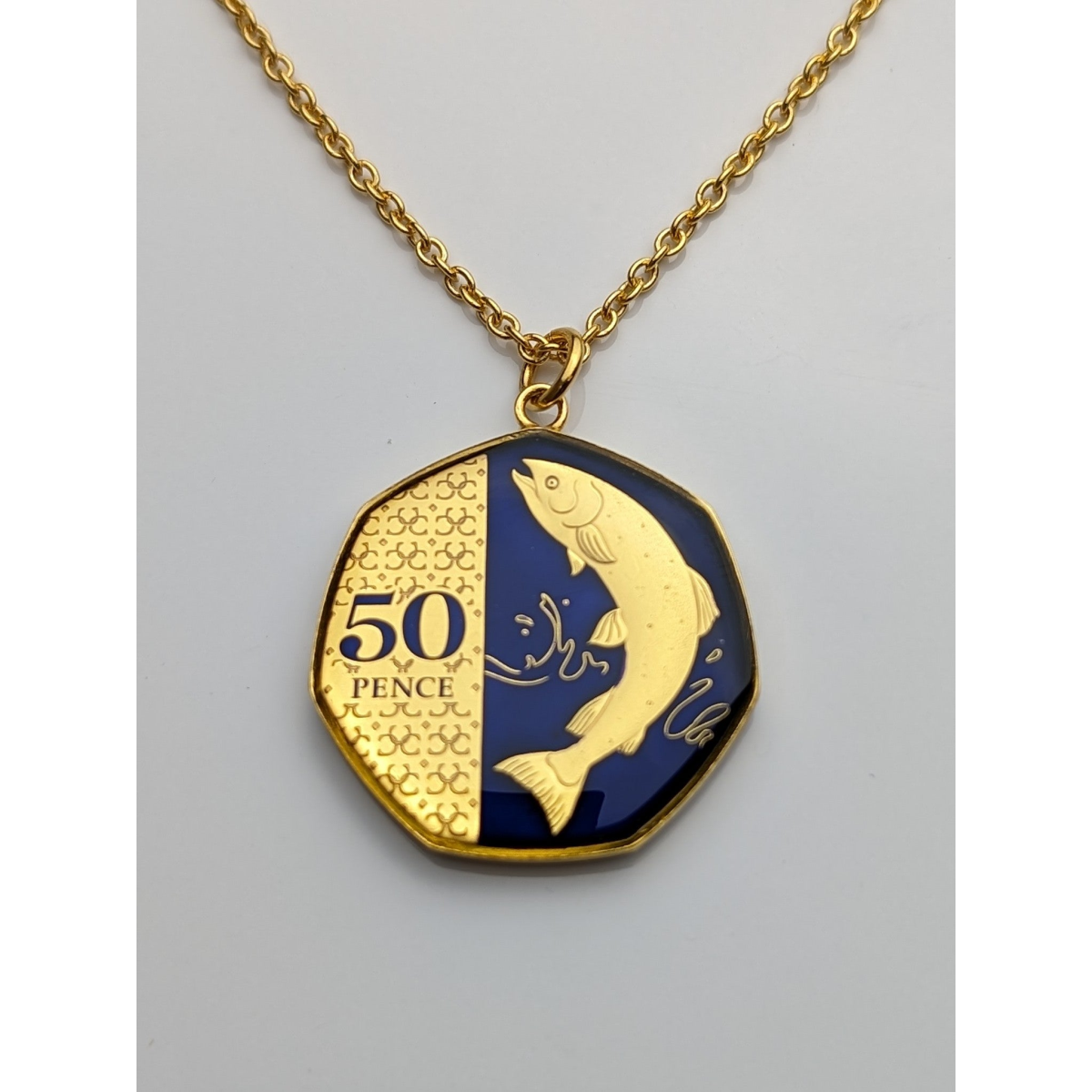 This necklace has been made using a King Charles III Fifty Pence. The design features an Atlantic salmon.