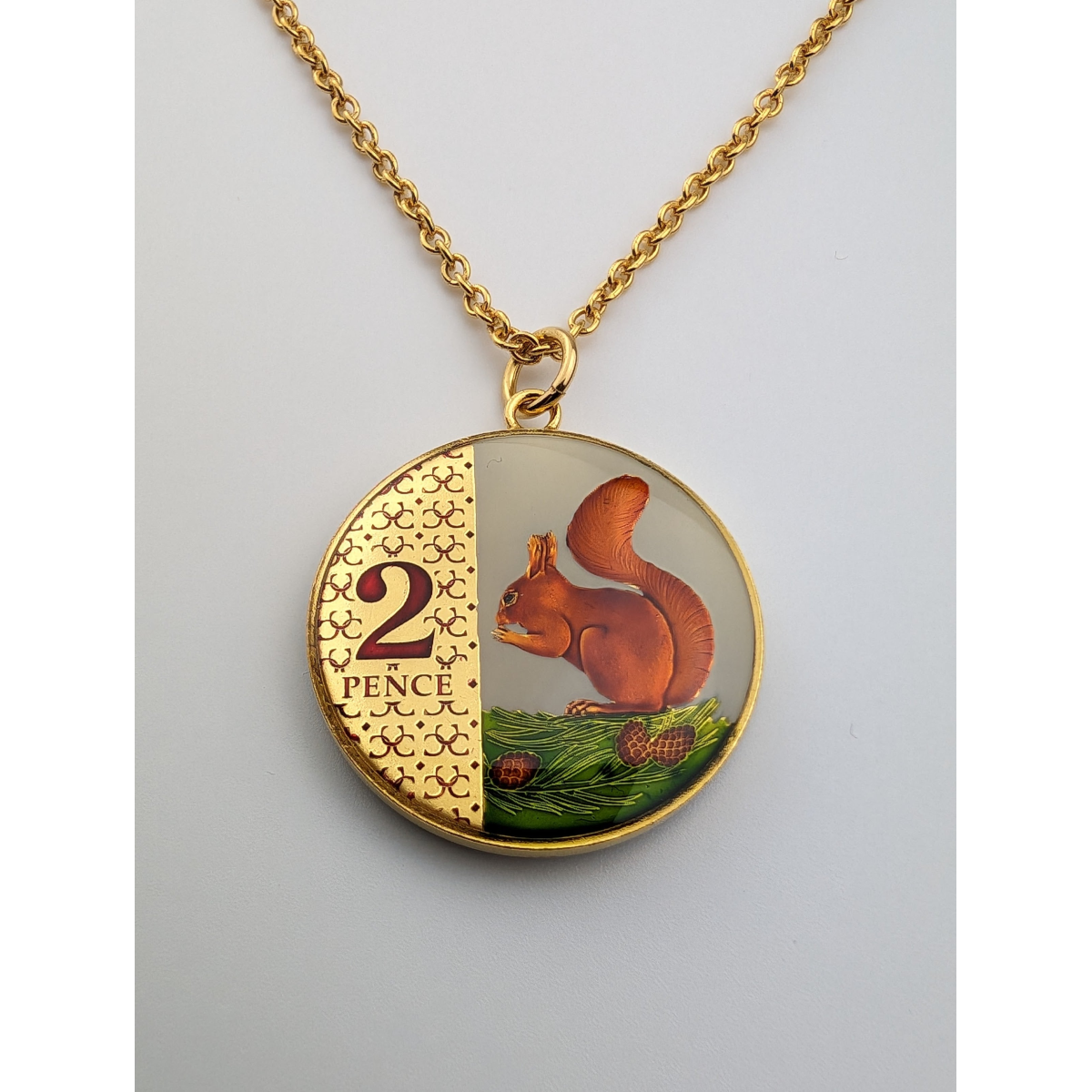 This necklace has been made using a King Charles III Two Pence. The design features a red squirrel.