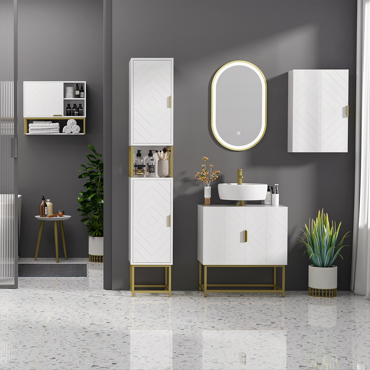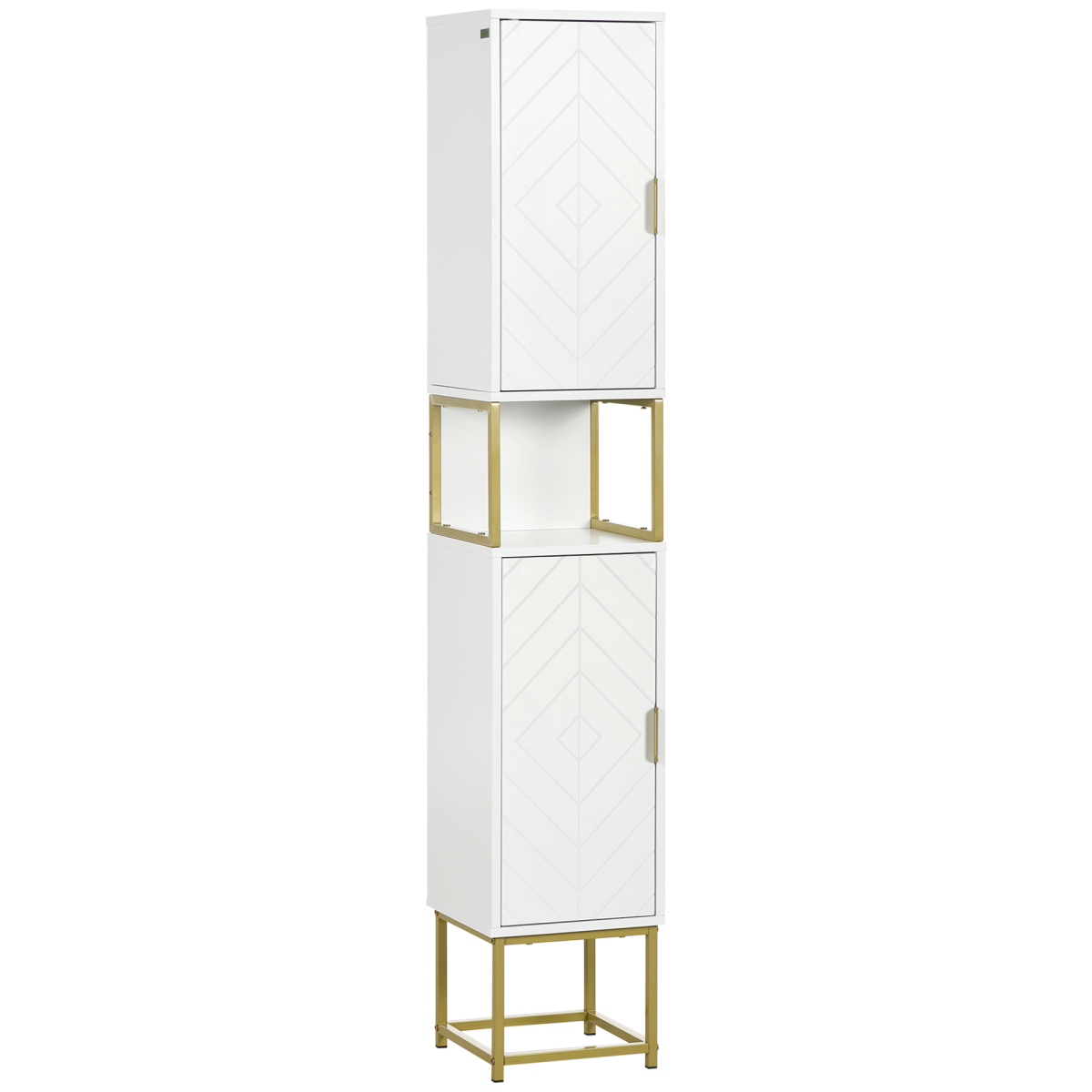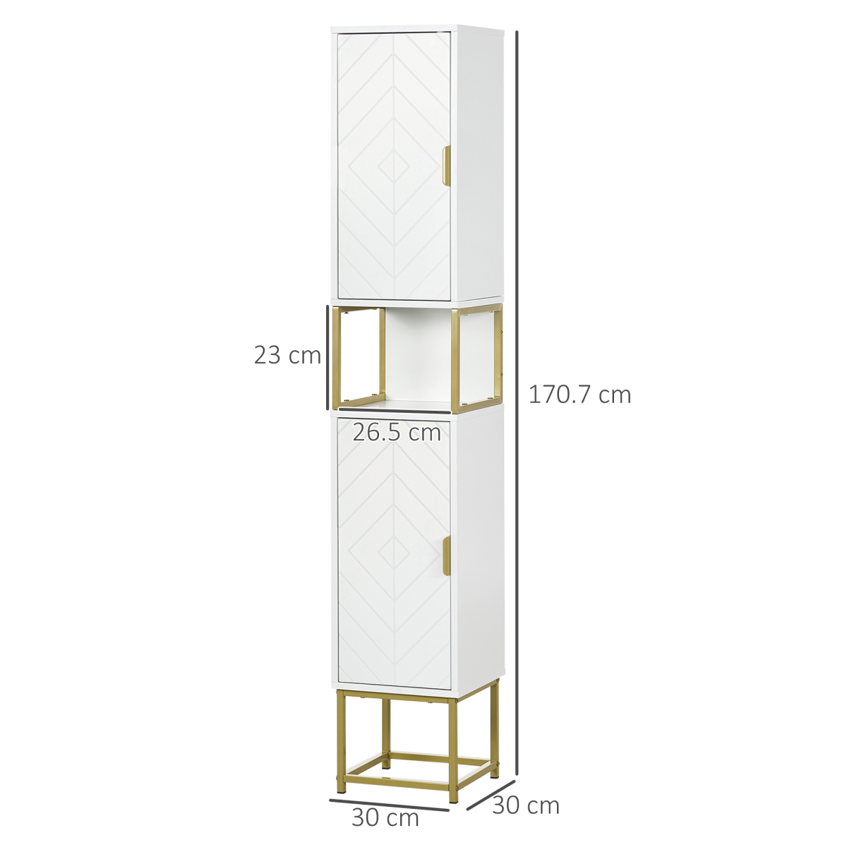 Tall bathroom cabinet, with storage: This slim storage cabinet is great for smaller spaces - with two cupboards and middle shelf.Modern: A white bathroom storage cabinet for simplicity, with gold-tone accents for a luxe touch.Steel base: Strong and supportive bottom for this bathroom unit - stands steady.Embossed doors: Adds a delicate bit of character to the overall look of this bathroom storage unit.Dimensions: 170.7H x 30W x 30Dcm. Maximum Weight Capacity: 30 kg (Overall), 3 kg (Each Shelf), Assembly required.