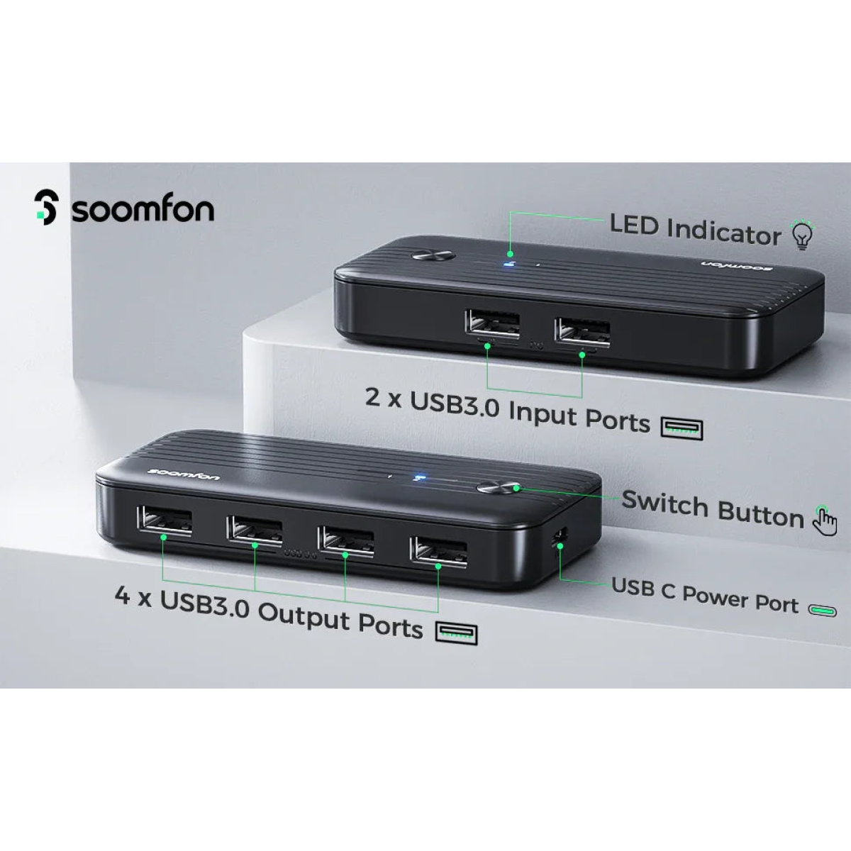 SOOMFON USB switcher adopts ABS material to prevent oxidation and rust, also with a compact and lightweight design.
