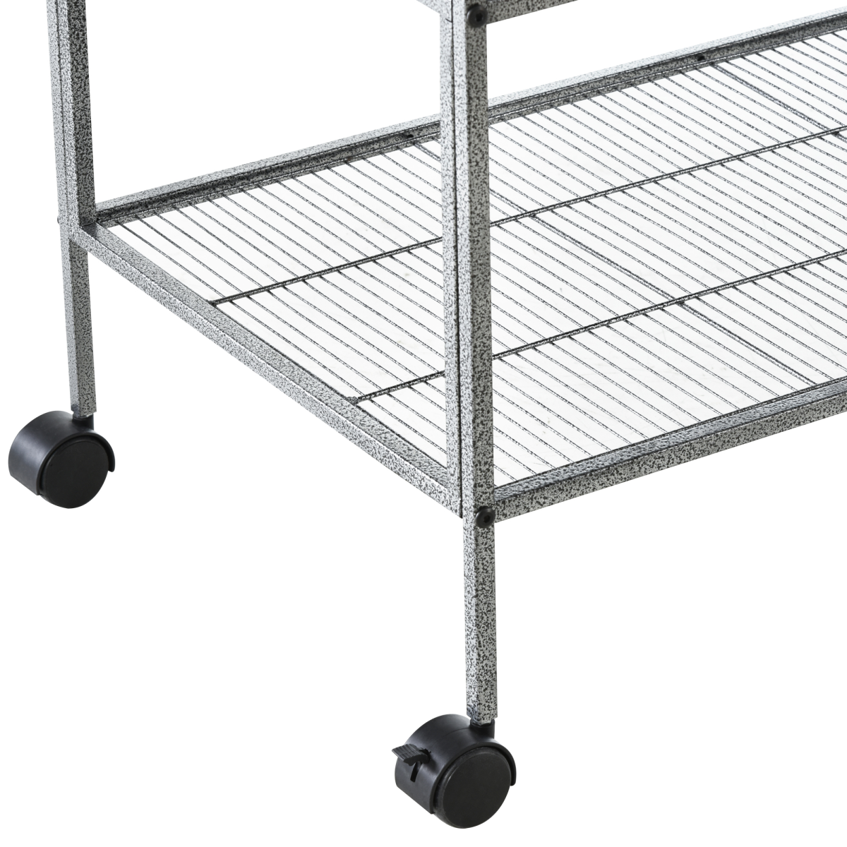 ROOMY BIRDHOUSE: Give your feathered friends the room they need to walk around comfortably, and fully flap and extend their wings. The middle grate can be pulled out to make the 2 individual cages into a big cage. This budgie cage with stand inside contains 4 wooden perches and 4 plastic food containers totally.CONVENIENT ACCESS: With 2 large front door, 4 sliding food doors, 2 side doors, you'll be able to easily access your bird's food, water, and the inside area. The bottom shelf of this canary cage can be used to place some pet supplies.STURDY AND DETACHABLE: Made of high-quality steel, metal wire, and durable plastic construction, this finch cage will provide years of use and enjoyment.EASY TO CLEAN: The 2 slide-out metal trays on the bottom is designed to catch birdseed, equips with convenient handles, easy to slide out for cleaning, and make your bird's home clean all the time.PORTABLE ROLLING STAND: Effortlessly move this rolling bird cage from one spot to the next. The 4 universal wheels, 2 with brakes, make move your feathered friend quick and secure. Overall Dimension: 95L x 45.5W x 102H cm.