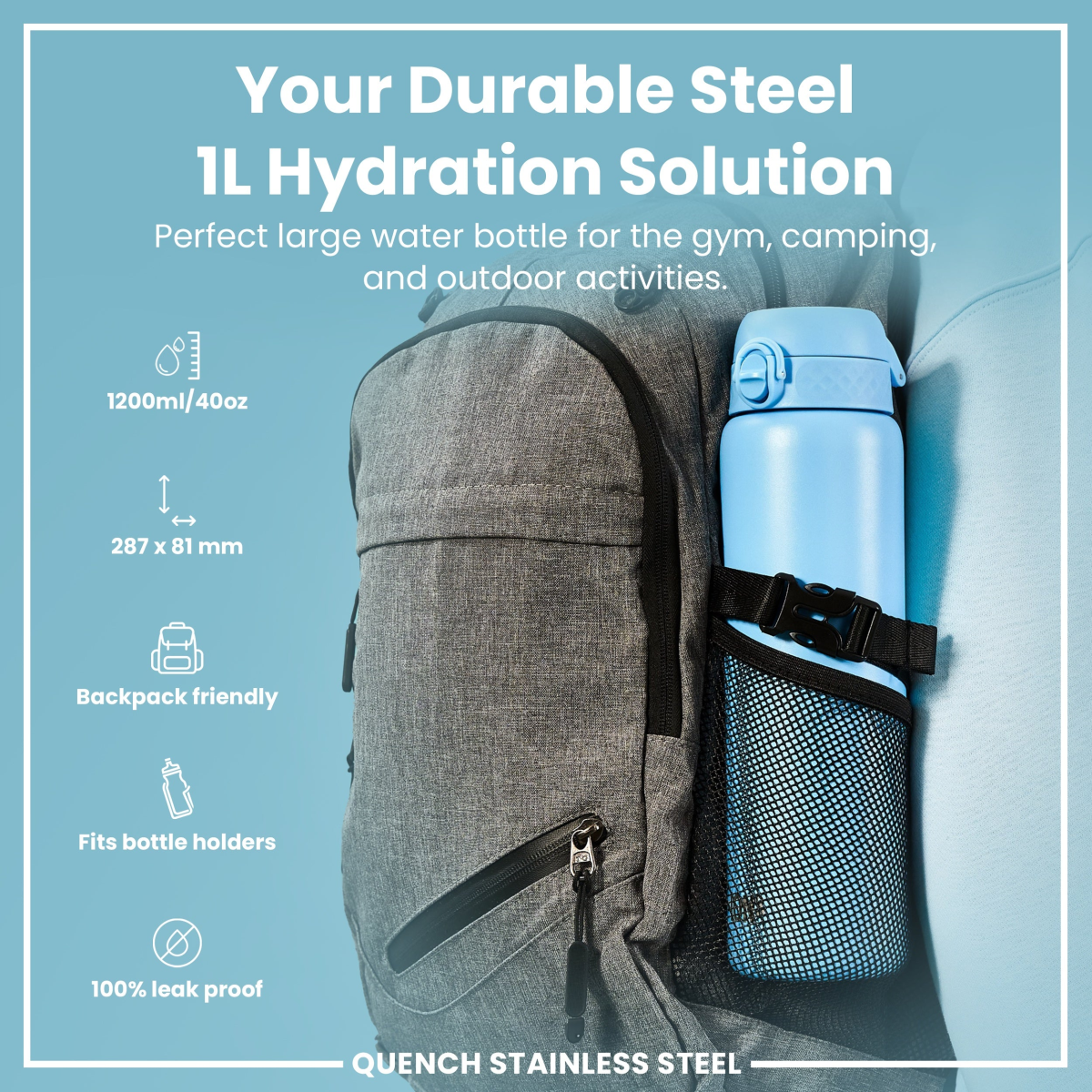 100% leak proof 1200ml / 40oz lightweight stainless steel blue water bottle with a smooth flow for spill-free hydration and hygienic full-flip top cover for one handed use on-the-go.