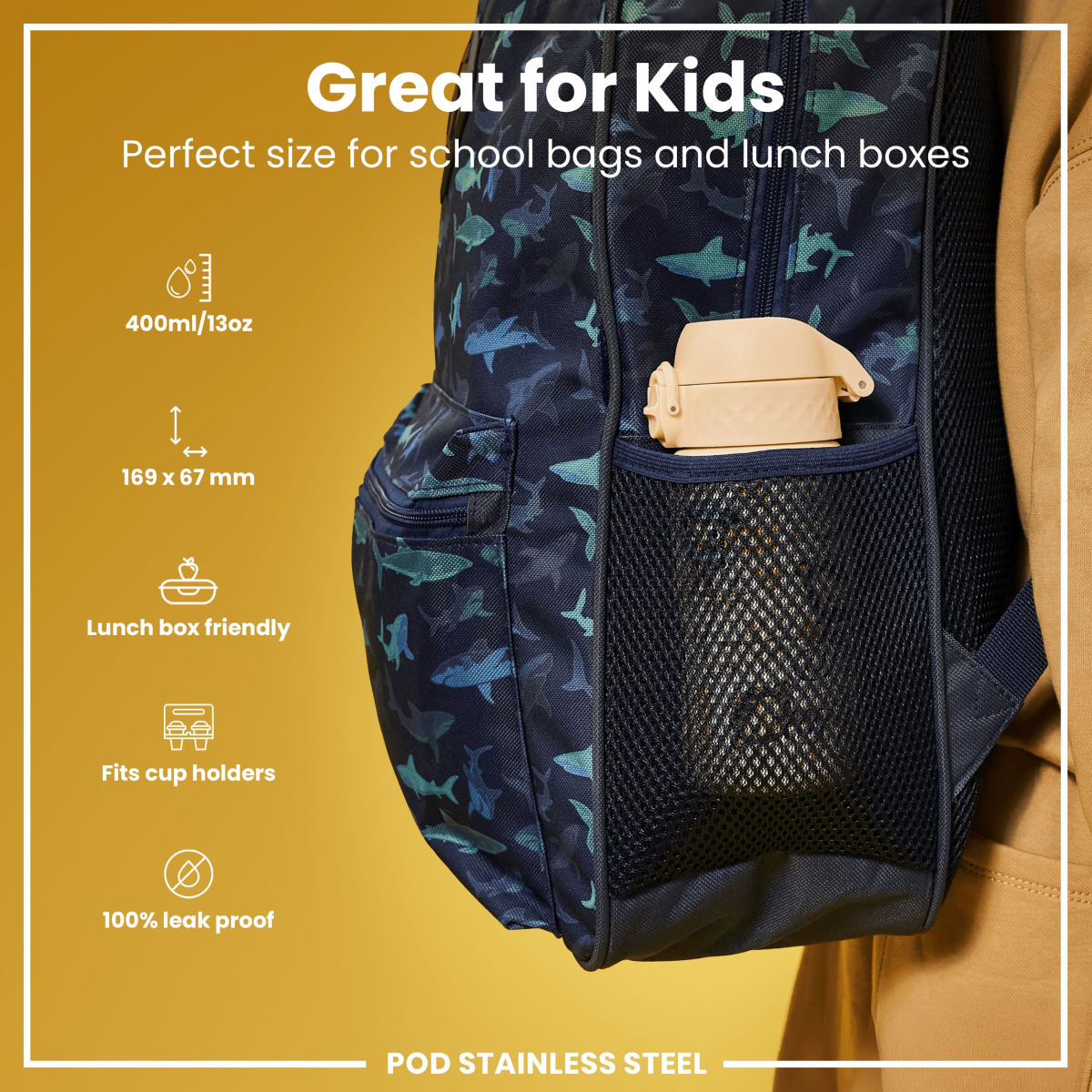 The perfect replacement for single use disposable cups. Small enough as a kids water bottle for their school lunch boxes or for smaller bags about town. The width of a soda can, it fits perfectly into all car cup holders and pockets on all backpacks.