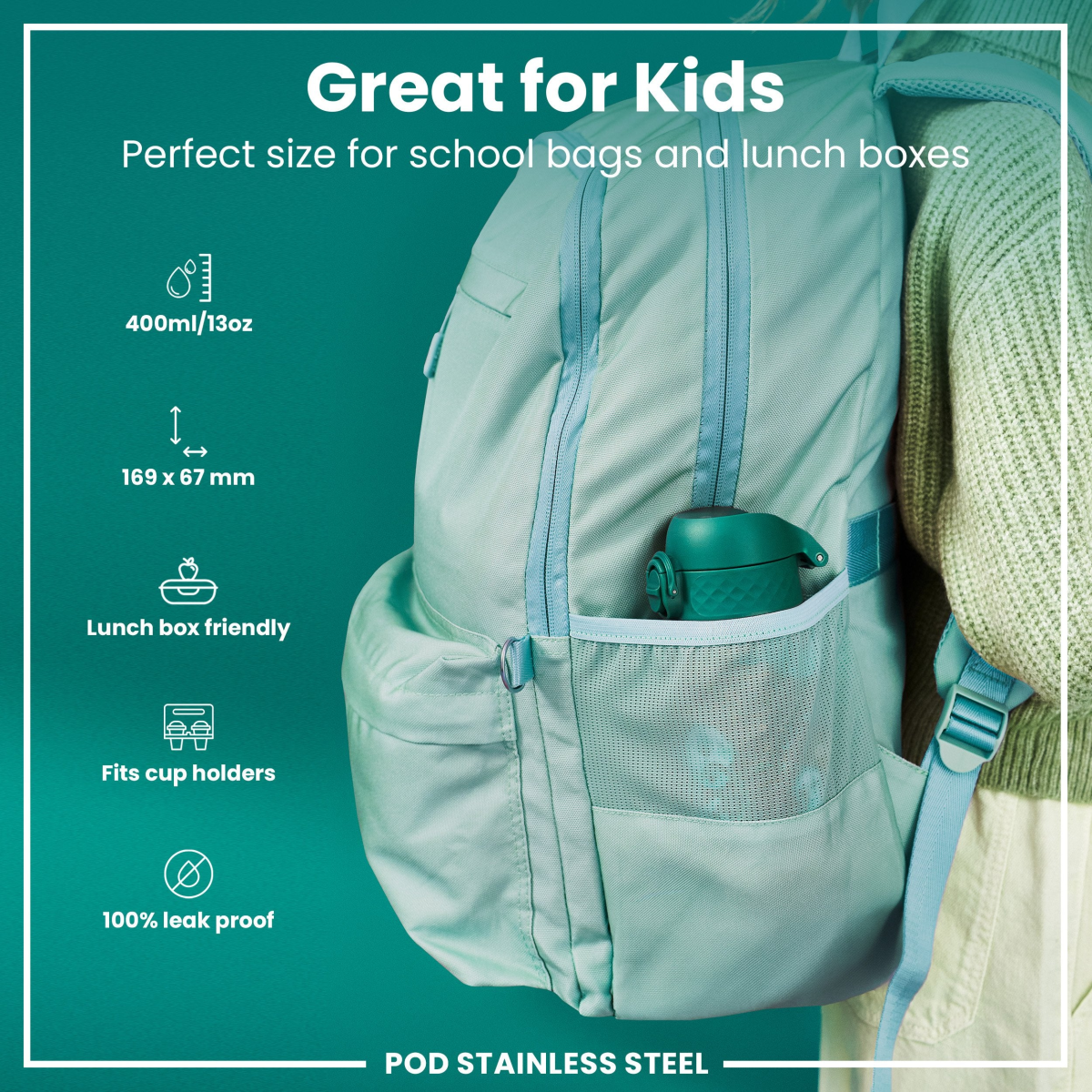 100% leak proof 400ml / 13oz stainless steel water bottles with a smooth flow for spill-free hydration and hygienic full-flip top cover for one handed use on-the-go.