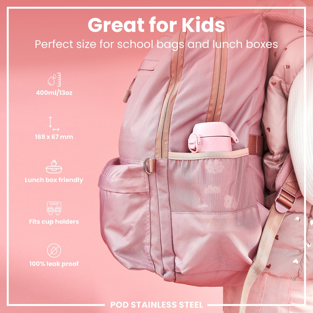100% leak proof 400ml / 13oz stainless steel water bottles with a smooth flow for spill-free hydration and hygienic full-flip top cover for one handed use on-the-go.