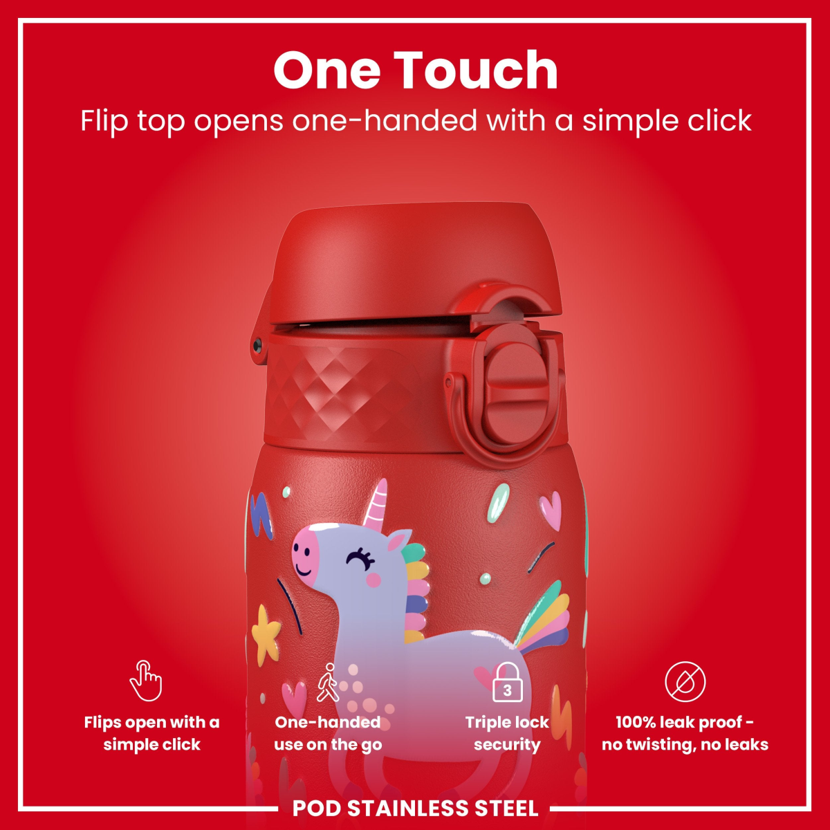 100% leak proof 400ml / 13oz stainless Unicorn Water Bottle with a smooth flow for spill-free hydration and hygienic full-flip top cover for one handed use on-the-go.