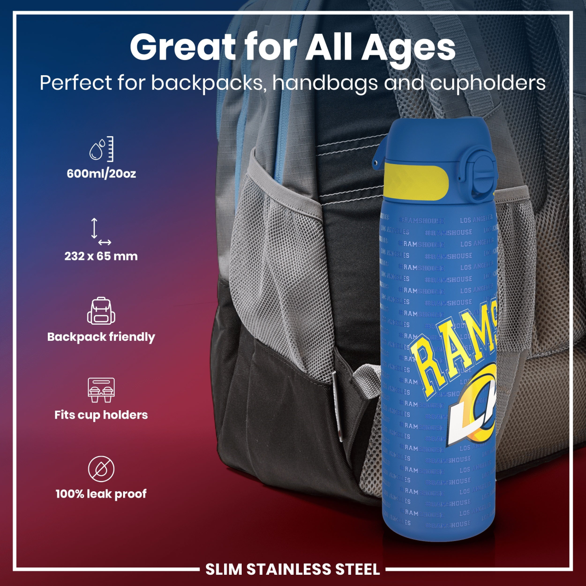 Leak Proof NFL Water Bottle, Stainless Steel, Los Angeles Rams, 600ml (20oz)