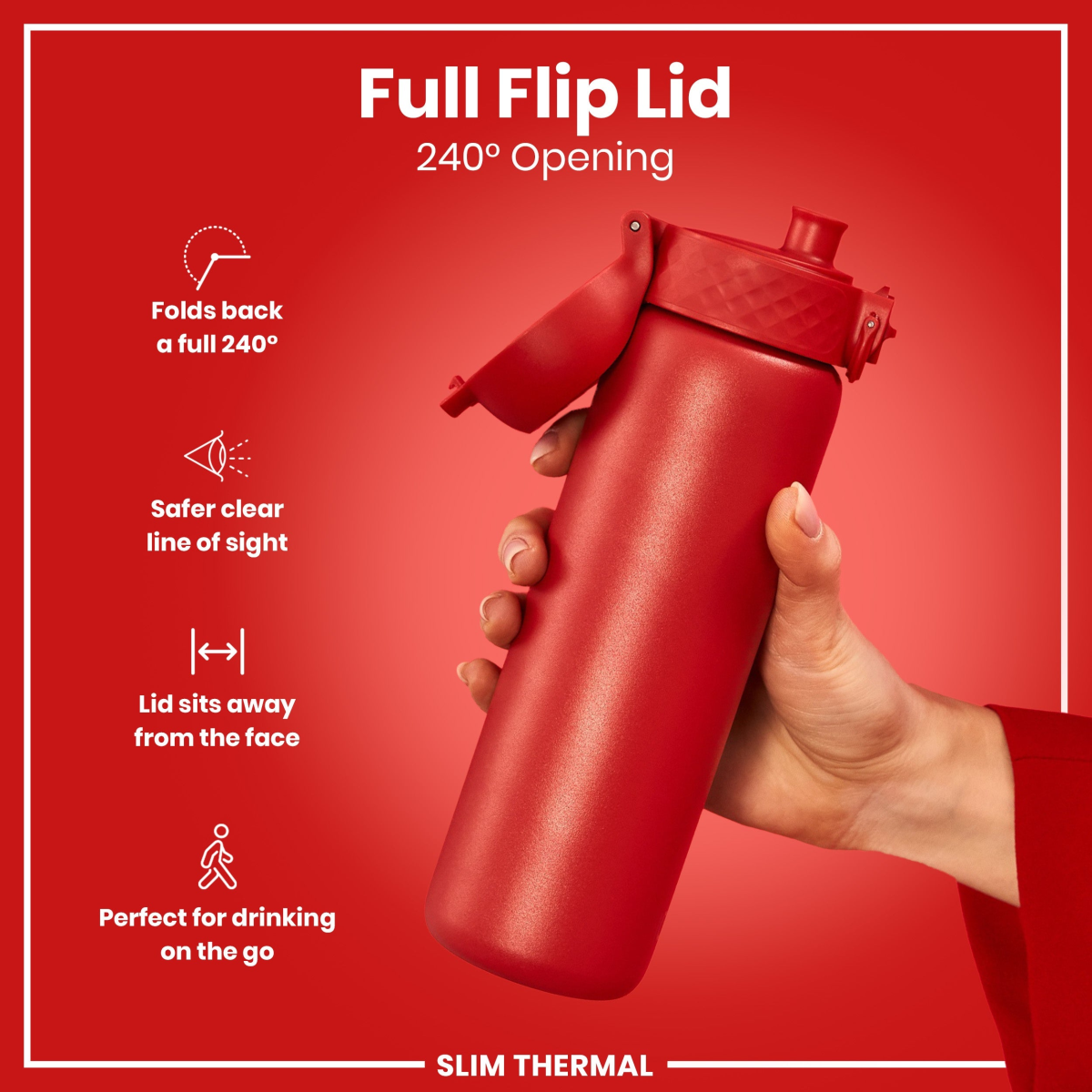 100% leak proof 500ml / 17oz vacuum insulated double wall stainless steel red water bottle with a smooth flow for spill-free hydration and hygienic flip top cover for one handed use on-the-go. Keeps hot drinks hot and cold drinks icy cold and fresh for hours.