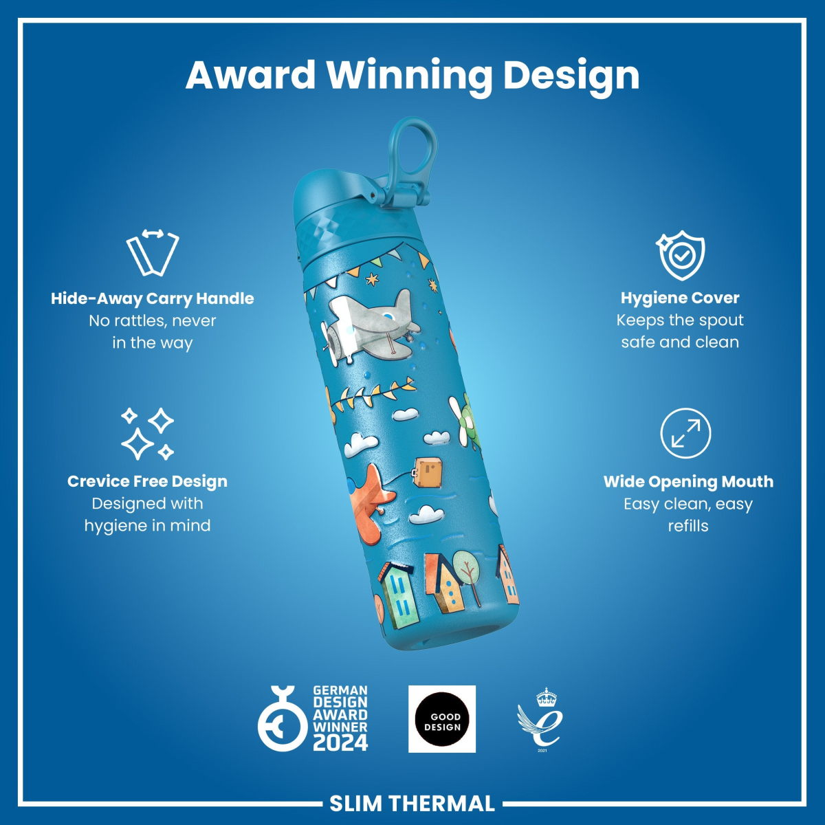 Leak Proof Slim Thermal Water Bottle, Insulated Steel, Airplanes, 500ml (17oz)
