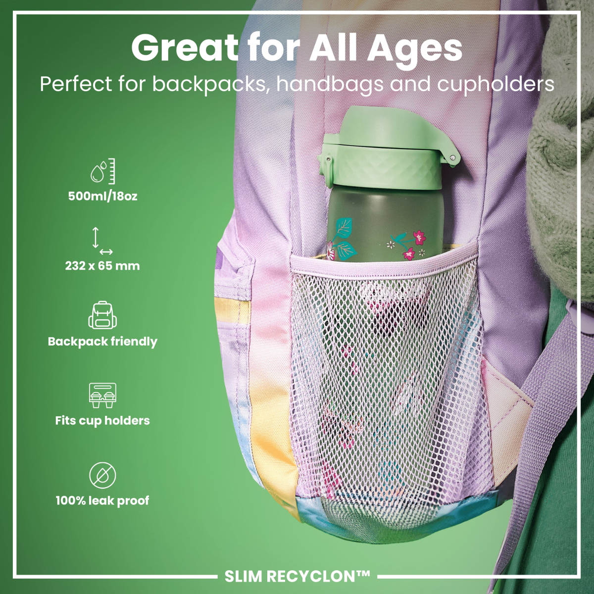 Leak Proof Slim Water Bottle, Recyclon, Wild Butterfly, 500ml (18oz)