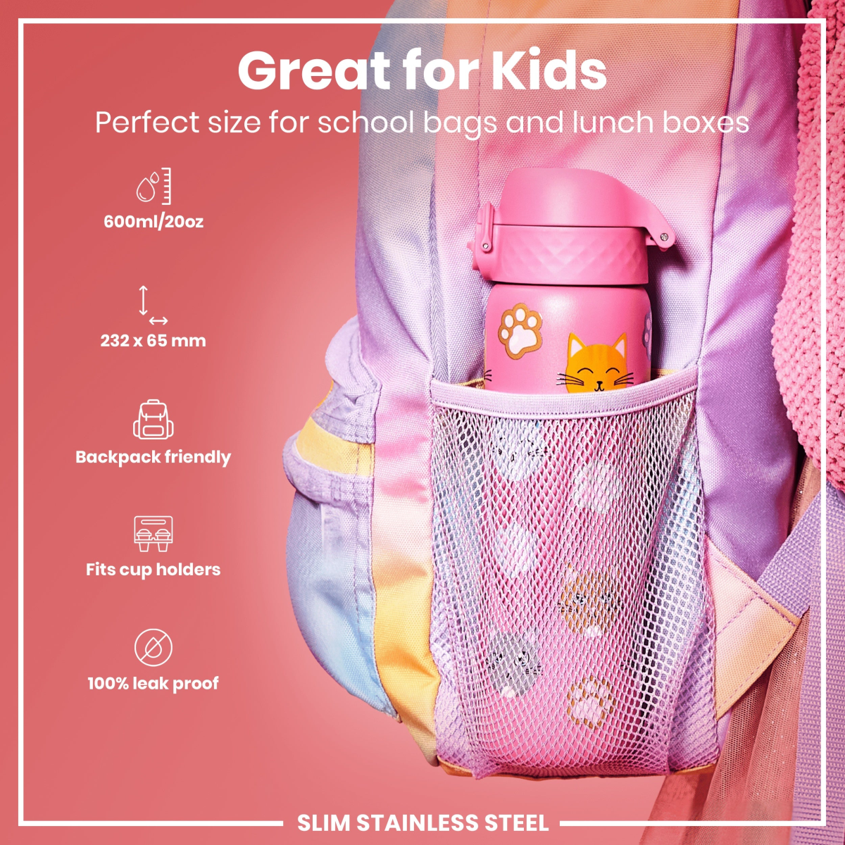 100% leak proof 600ml / 20oz stainless steel water bottles with a smooth flow for spill-free hydration and hygienic full-flip top cover for one handed use on-the-go.