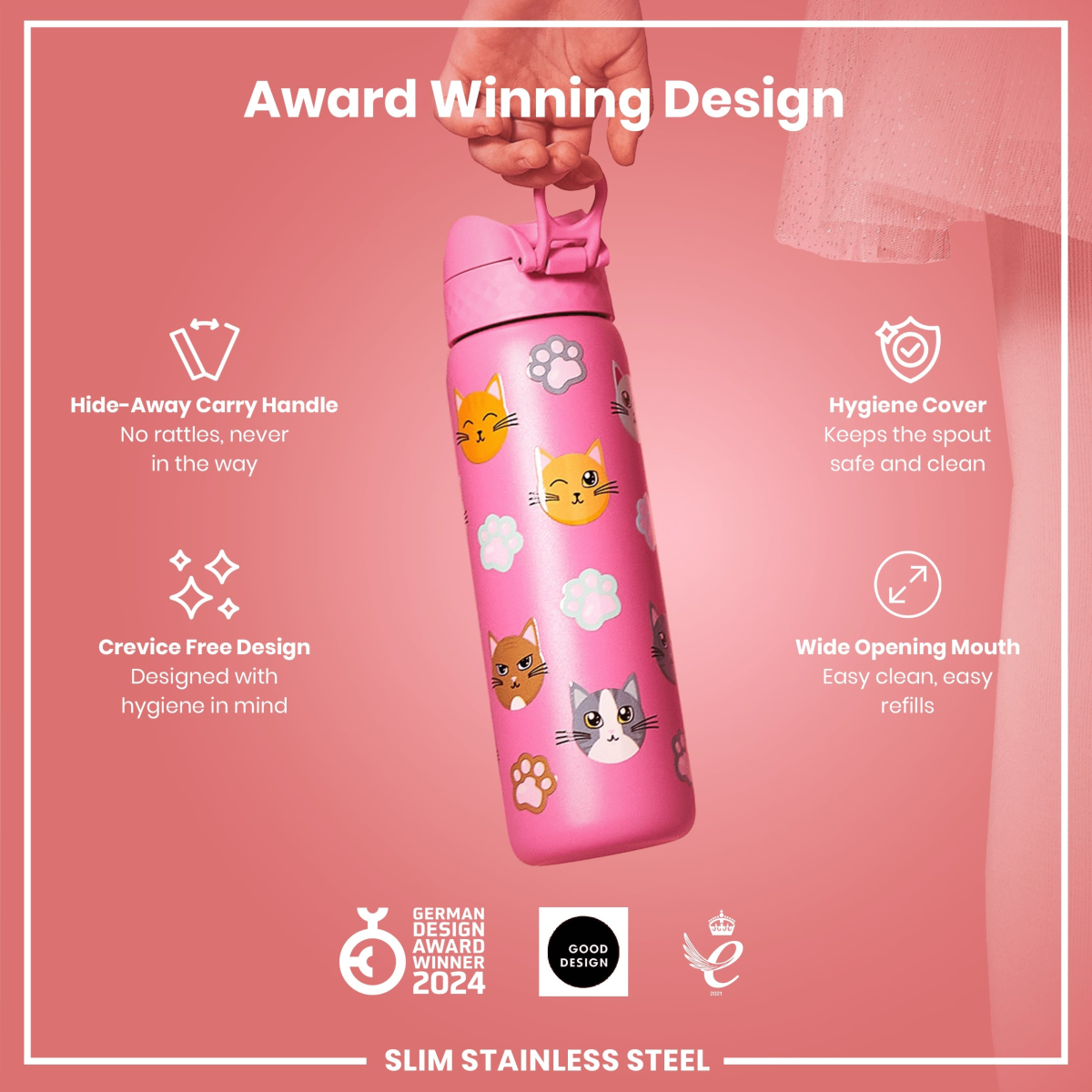 Made from lightweight stainless steel. Stainless steel is extremely durable, lasts for years, and is fully recyclable. This refillable and reusable pink water bottle is food safe, odour resistant, easy to hand wash, and keeps drinks fresh and full of flavour.