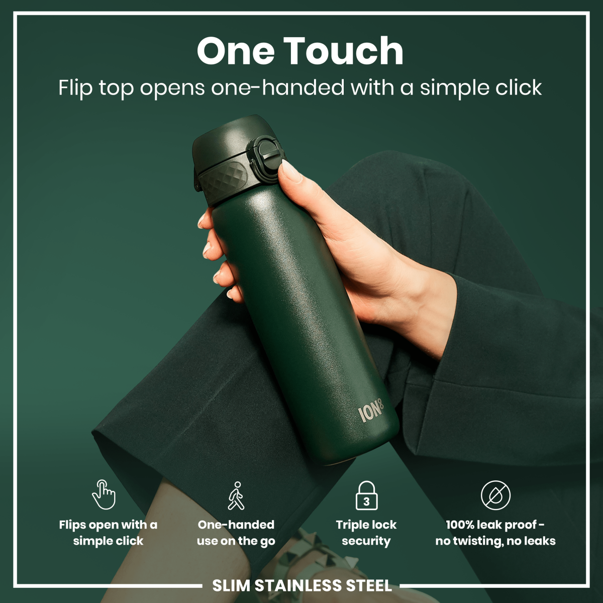 Leak Proof Slim Water Bottle, Stainless Steel, Dark Green, 600ml (20oz)