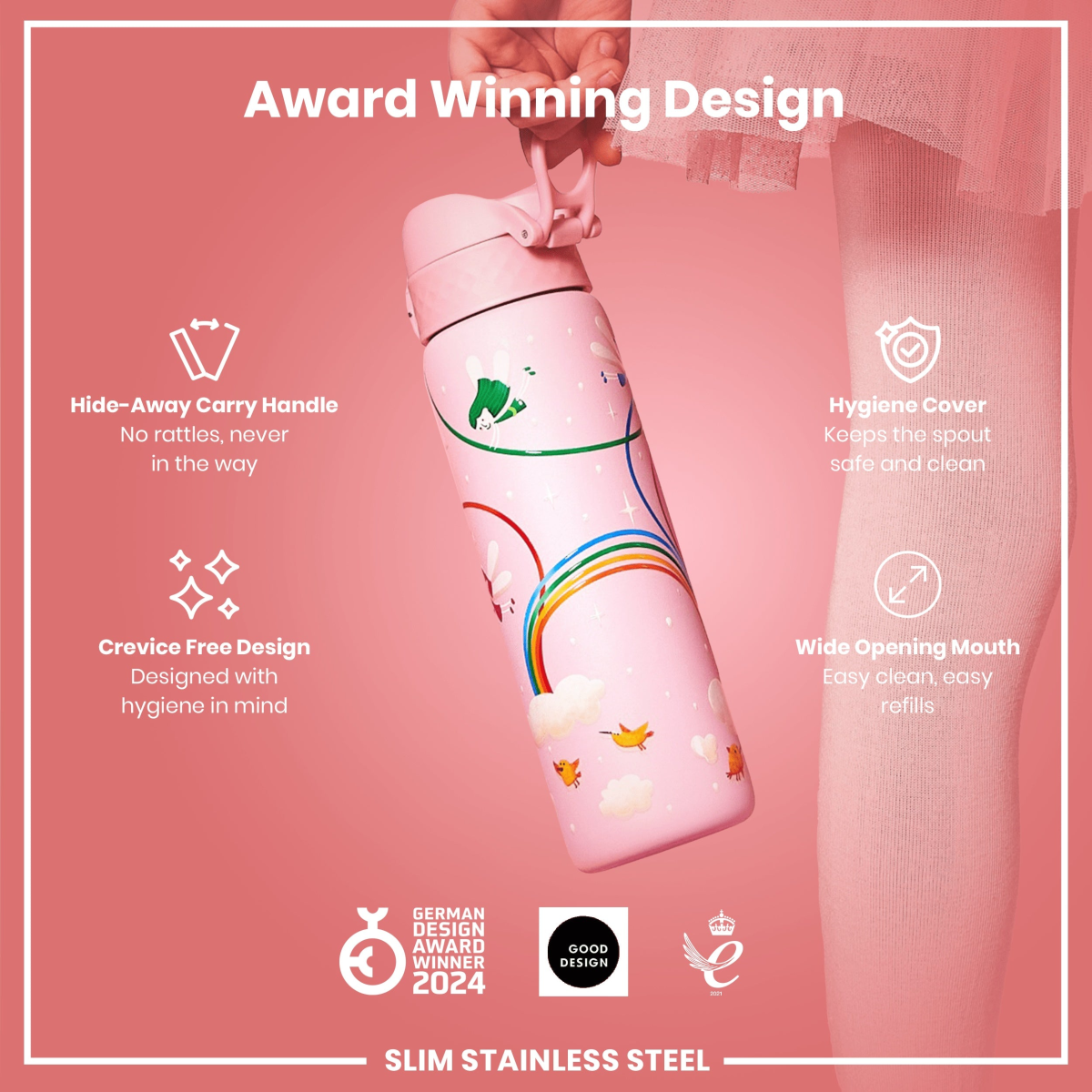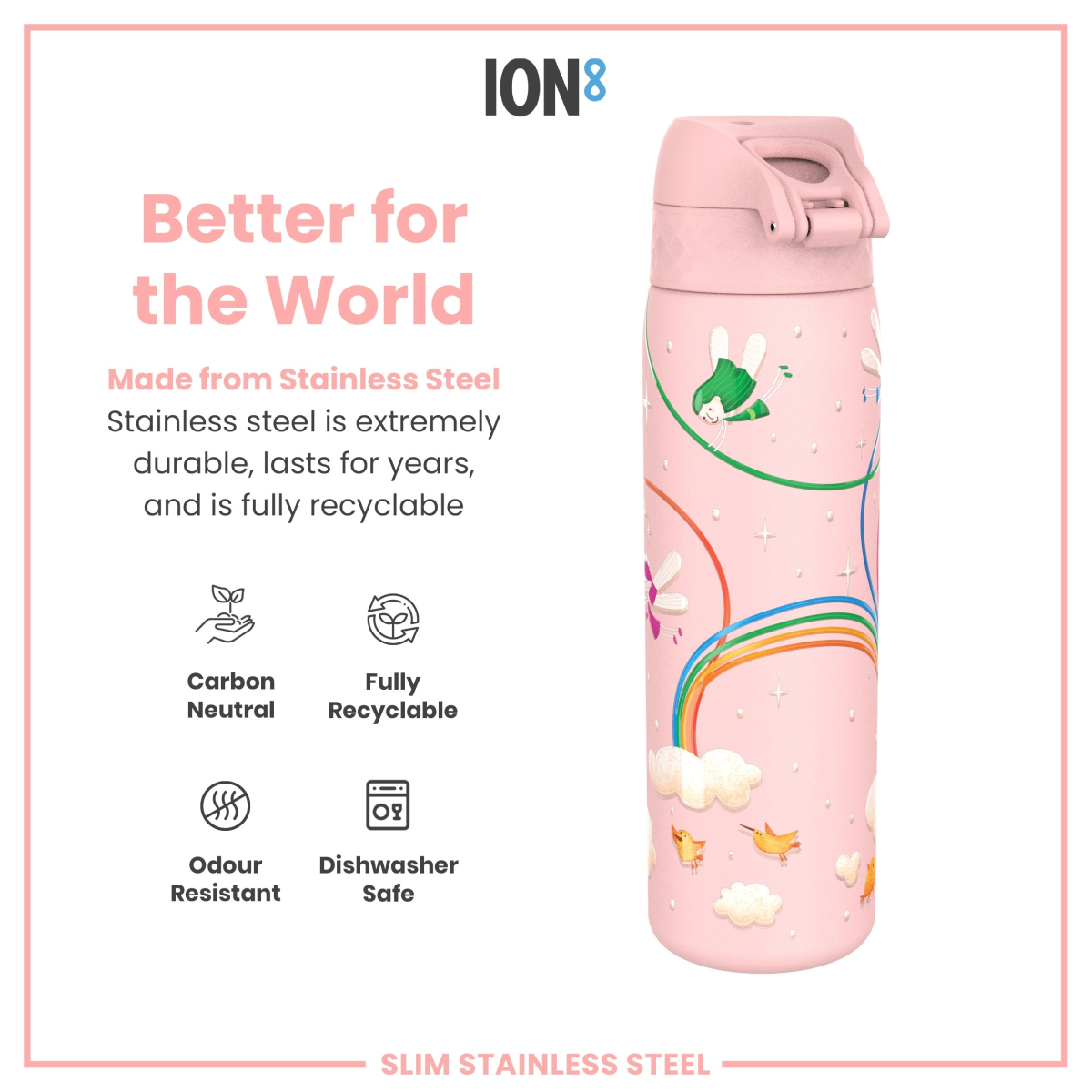 Made from lightweight stainless steel. Stainless steel is extremely durable, lasts for years, and is fully recyclable. This refillable and reusable pink water bottle is food safe, odour resistant, easy to hand wash, and keeps drinks fresh and full of flavour.