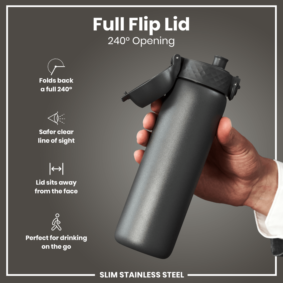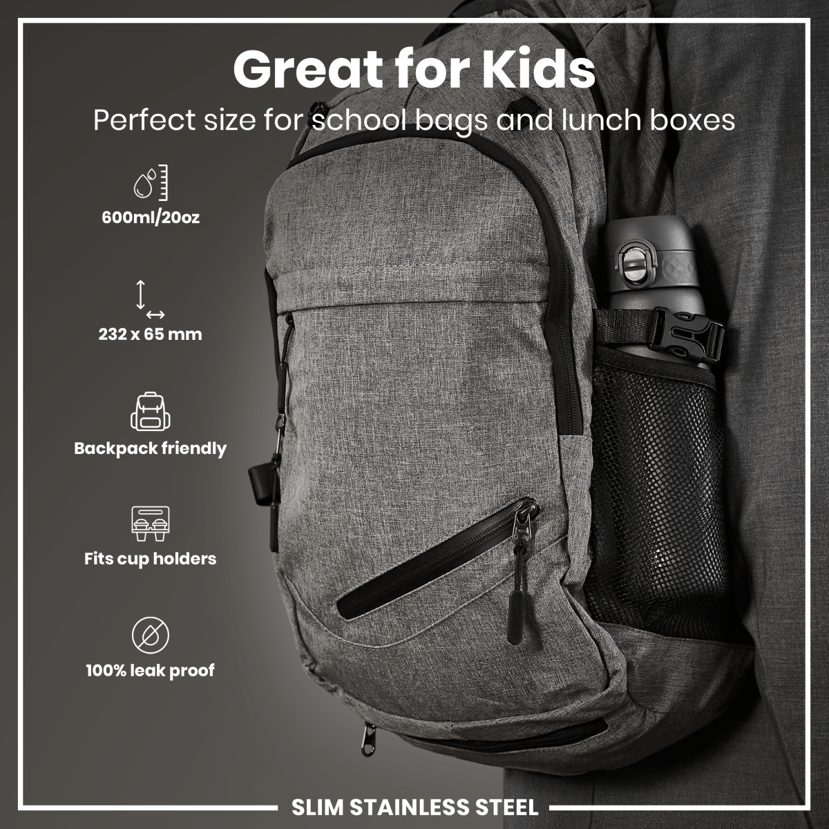 100% leak proof 600ml / 20oz stainless steel grey water bottle with a smooth flow for spill-free hydration and hygienic full-flip top cover for one handed use on-the-go.