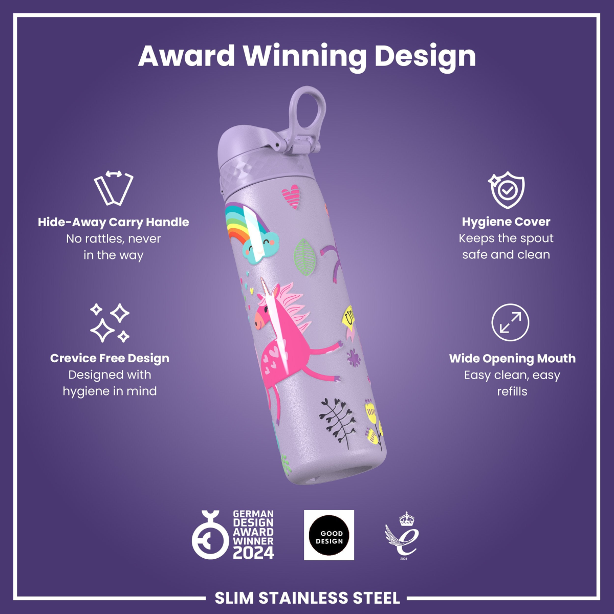 Leak Proof Slim Water Bottle, Stainless Steel, Purple Unicorns, 600ml (20oz)