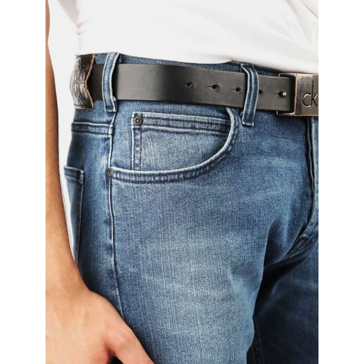 Men's straight-leg, low-rise jeans with a button closure. A brand logo patch is located on the back of the waistband.