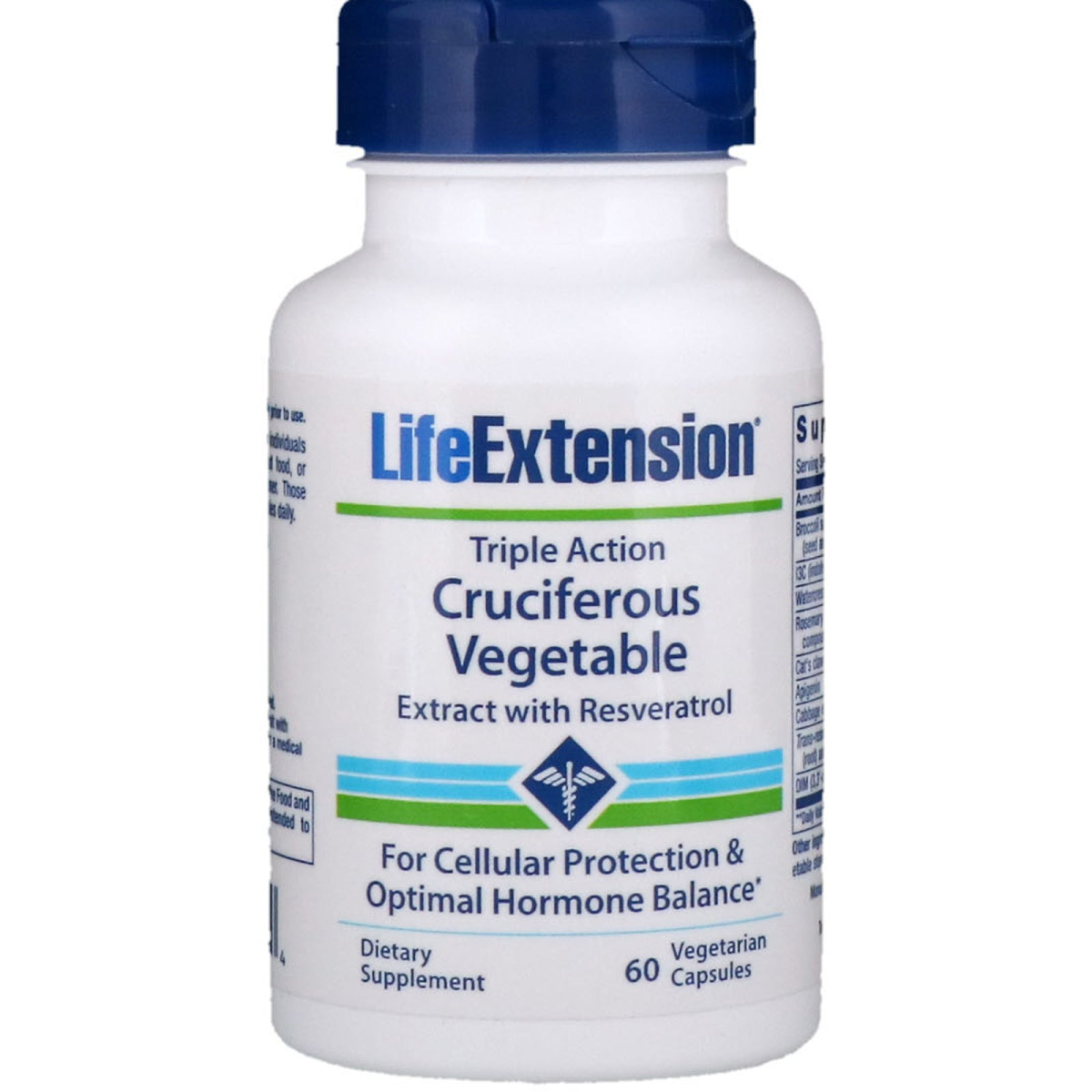 For Cellular Protection & Optimal Horomone Balance Dietary Supplement Non-GMO Scientists have identified specific extracts from cruciferous vegetables — such as broccoli, cauliflower, cabbage and Brussels sprouts — that help maintain healthy hormone levels. Maintaining optimal hormone balance is essential to any anti-aging strategy. Triple Action Cruciferous Vegetable Extract combines some of these botanical extracts into the most comprehensive food-based, plant compilation for cell protection yet. I3C (Indole-3-carbinol) and DIM (Di-indolyl-methane) favorably modulate estrogen metabolism and induce liver detoxification enzymes to help neutralize potentially harmful estrogen metabolites and xenoestrogens (estrogen-like environmental chemicals). Extracts of broccoli, watercress, and rosemary provide glucosinolates, isothiocyanates, carnosic acid, and carnosol — bioactive compounds that have a multitude of favorable effects on estrogen metabolism and cell division. Apigenin, a powerful plant flavonoid, is also added to the formula to boost cell protection, while cabbage extract, a natural source of benzyl isothiocyanate (BITC), is included to maintain cell health. Life Extension has combined its cruciferous vegetable complex with trans-resveratrol based on indications from published scientific literature that resveratrol may be the most effective compound for maintaining optimal health and promoting longevity. The whole grape extract contains a spectrum of polyphenols naturally found in red wine, such as proanthocyanidins, anthocyanins, and flavonoids.