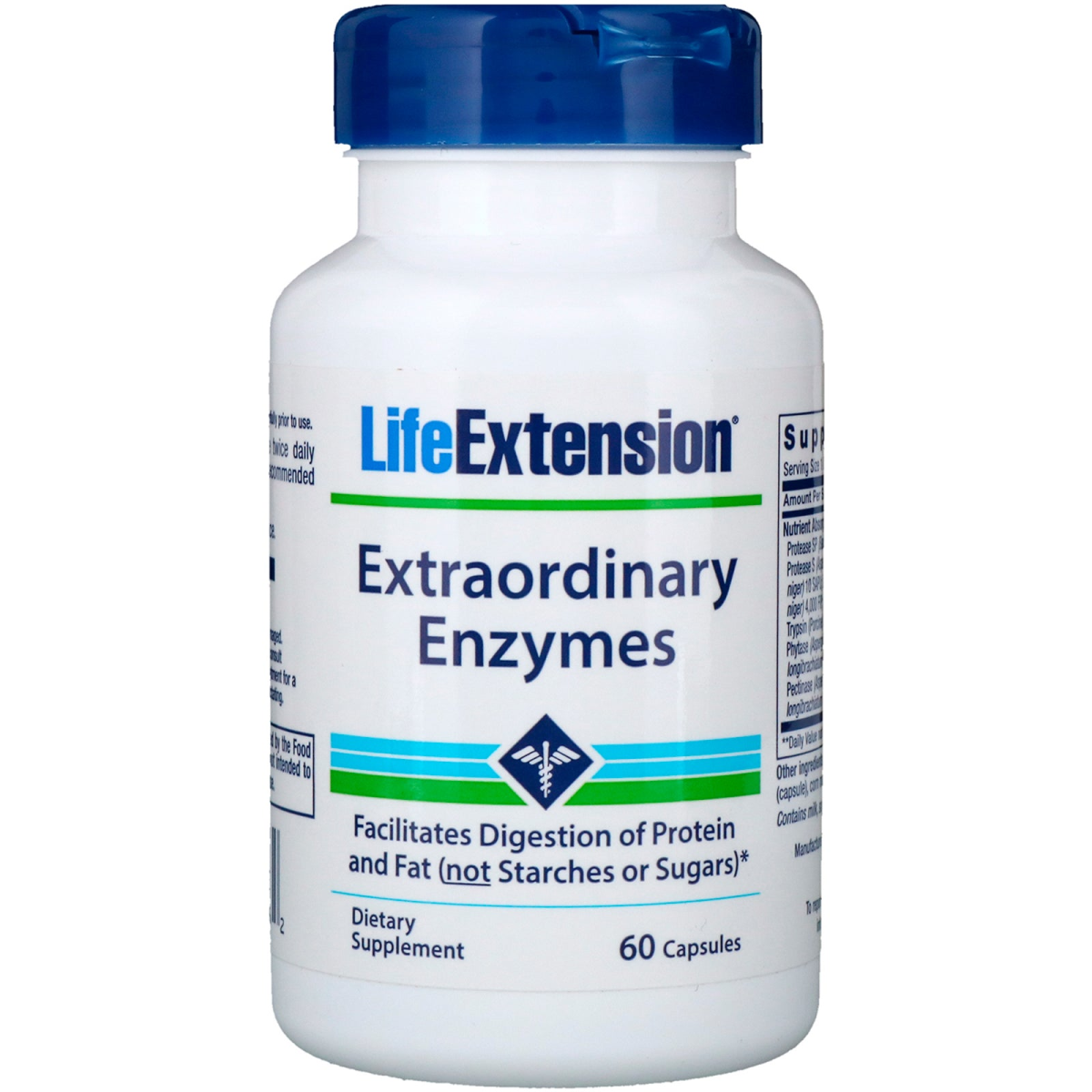Facilitates Digestion of Protein and Fat (Not Starches or Sugars) Dietary Supplement Extraordinary Enzymes Human studies suggest that supplementary enzymes may improve digestion and help minimize post-meal glucose surges. Since proteins, plant fibers, and fats are broken down differently, one needs the proper spectrum of enzymes for optimal digestion. A new multi-enzyme formula facilitates both optimal nutrient absorption and broad relief from digestive discomforts without promoting after-meal glucose surges. Extraordinary Enzymes provides a potent array of protease, cellulase, and lipase enzymes specially formulated to adapt to a variety of stomach acid pH conditions and powerfully support digestion. With a total of twelve different enzymes, this unique formula supports the digestion of just about any food that may pose a problem for you—whether a protein, fiber, or fat. Extraordinary Enzymes provides a blend of powerful enzymes to help your system convert a variety of foods to energy and readily absorb the nutrients in the foods you consume. This formulation may enhance protein content in your body and allow for better fat utilization. Together, these enzymes work by an all-natural, synergistic process to help provide nutritional support for a healthy digestive system. Unlike commercial digestive enzyme supplements, amylase is intentionally left out of Extraordinary Enzymes. The reason is that amylase breaks down starches into glucose that is rapidly absorbed into the bloodstream. Extraordinary Enzymes facilitates the healthy break