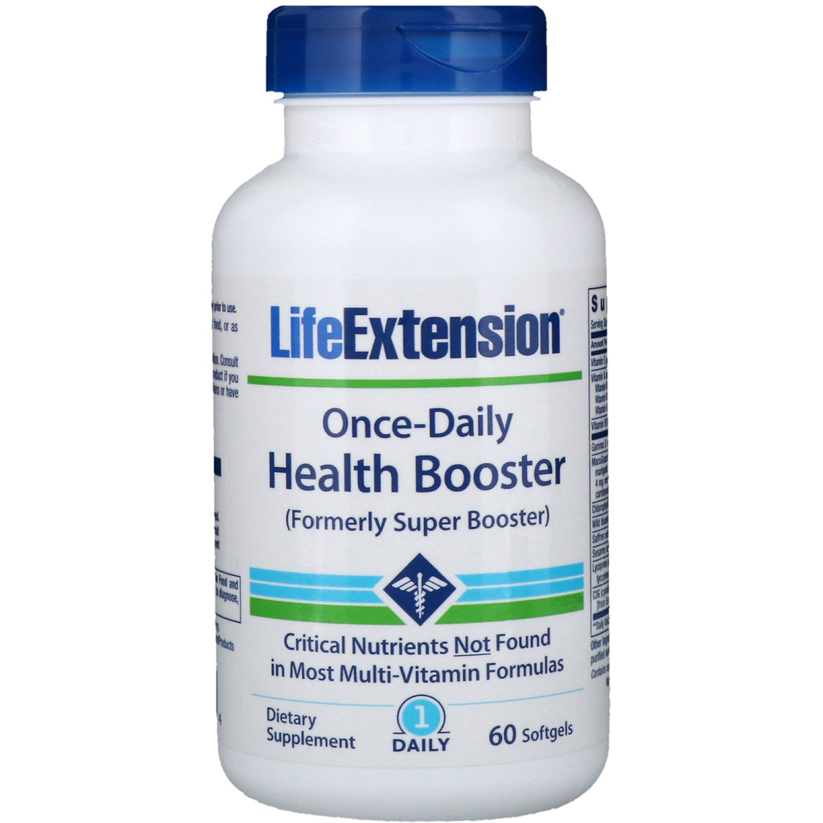 (Formerly Super Booster) Critical Nutrients Not Found in Most Multi-Vitamin Formulas Dietary Supplement 1 Daily Life Extension's Once-Daily Health Booster(formerly known as Super Booster)is a cost-effective formula that combines a variety of valuable nutrients in one softgel. Health Booster contains many critical nutrients missing from most multivitamin formulas in a convenient daily softgel, designed to complement the Life Extension Mix or One/Two-Per-Day formulas. Once-Daily Health Booster provides the following nutrients: Vitamins K1 and K2, including the rapidly absorbed MK-4 and the 24-hour bioavailable MK-7,1 to keep calcium in the bones and out of the arteries. MacuGuard proprietary blend, which contains trans-zeaxanthin, meso-zeaxanthin, and lutein to support eye health and healthy vision, now contains alpha-carotene to further support macular health. Saffron has been added to help maintain visual acuity, based on cutting edge research findings Gamma tocopherol, a highly effective form of vitamin E, which quenches a dangerous free radical (peroxynitrite) that plays a major role in age-related decline. Vitamin E as D-alpha tocopherol to suppress lipid peroxidation. Blueberry extract to boost DNA function and sustain healthy blood sugar levels already within normal range. Sesame lignans to boost tissue levels of gamma tocopherol. Lycopene to support prostate health and guard against LDL oxidation. Chlorophyllin, which offers protection against environmentally induced DNA damage. Black currant extract anthocyanins to promote eye health. Vitamin B12 to help maintain a healthy nervous system and metabolism. Just one softgel of the new Health Booster taken with a heavy meal provides optimized potencies of fat-soluble vitamins, carotenoids, and other nutrients needed by maturing individuals. Taken separately, the individual ingredients in Once-Daily Health Booster would cost two to three times more.