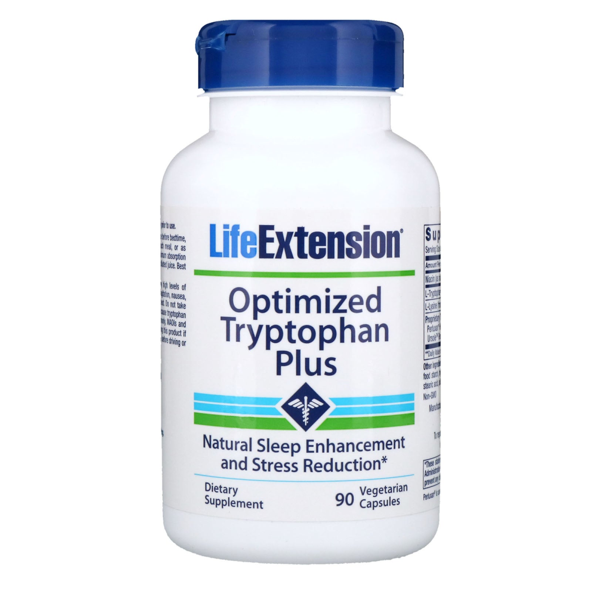 Natural Sleep Enhancement and Stress Reduction Dietary Supplement Optimized Tryptophan Plus Serotonin is a neurotransmitter in the brain associated with positive moods and restful sleep. To produce and maintain optimum serotonin levels, your body requires tryptophan, an essential amino acid the body can’t produce. In the body, tryptophan has been shown to improve sleep, enhance mood and modulate stress. So Life Extension offers Optimized Tryptophan Plus to broadly and powerfully support tryptophan levels already within the normal range. The basis for this formula is premium L-tryptophan, which has undergone significantly more rigorous manufacturing processes than regular tryptophan material to assure the highest purity and safety. In addition to an optimum amount of premium tryptophan … this formula also provides a unique, balanced supply of other nutrients found to help maintain tryptophan activity in the body. Those nutrients include lysine, niacinamide, and extracts of hops and rosemary to provide nutritive support for the body’s production of serotonin.