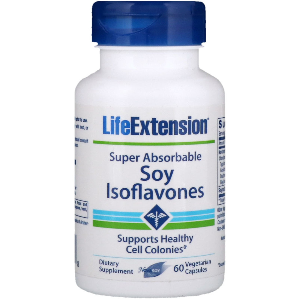 Supports Healthy Cell Colonies Contains NovaSoy - The Power of Soy Dietary Supplement Super-Absorbable Soy Isoflavones The beneficial effects of genistein and other soy isoflavones have been shown in numerous published studies. These studies reveal that those who consume the most soy maintain healthier cell biological function and proliferation. The three major isoflavones found in soybeans are genistein, daidzein, and glycitein. Soy isoflavones exert both estrogenic and anti-estrogenic effects, depending on the tissue in which they are acting. They are structurally similar to 17-estradiol, a mammalian estrogen, and are thus called phytoestrogens. They also have non-hormonal effects, including signal transduction and antioxidant activity. Soy isoflavones may inhibit bone resorption and help stimulate bone formation, without the side effects of hormone replacement therapy. Other constituents of soy have also demonstrated effects that help explain the health and longevity of Asian populations who consume a great deal of soy in their diet. In response to increasing evidence that other constituents of soy may provide significant cell-protective effects, a formulation has been developed that provides soy extract standardized to isoflavones plus fermented soyfood (Natto) that may provide additional benefits. Natto enhances isoflavone absorption and provides other nutrients contributed by the fermentation process. The enhanced absorption of genistein, daidzein, etc., may be significant enough that only one capsule of Super Absorbable Soy Isoflavones is required each day. The non-GMO Soynatto used in this formula is produced by a yeast fermentation process. Japanese researchers have found that this type of cultured broth from yeast helps promote healthy cell function and proliferation.