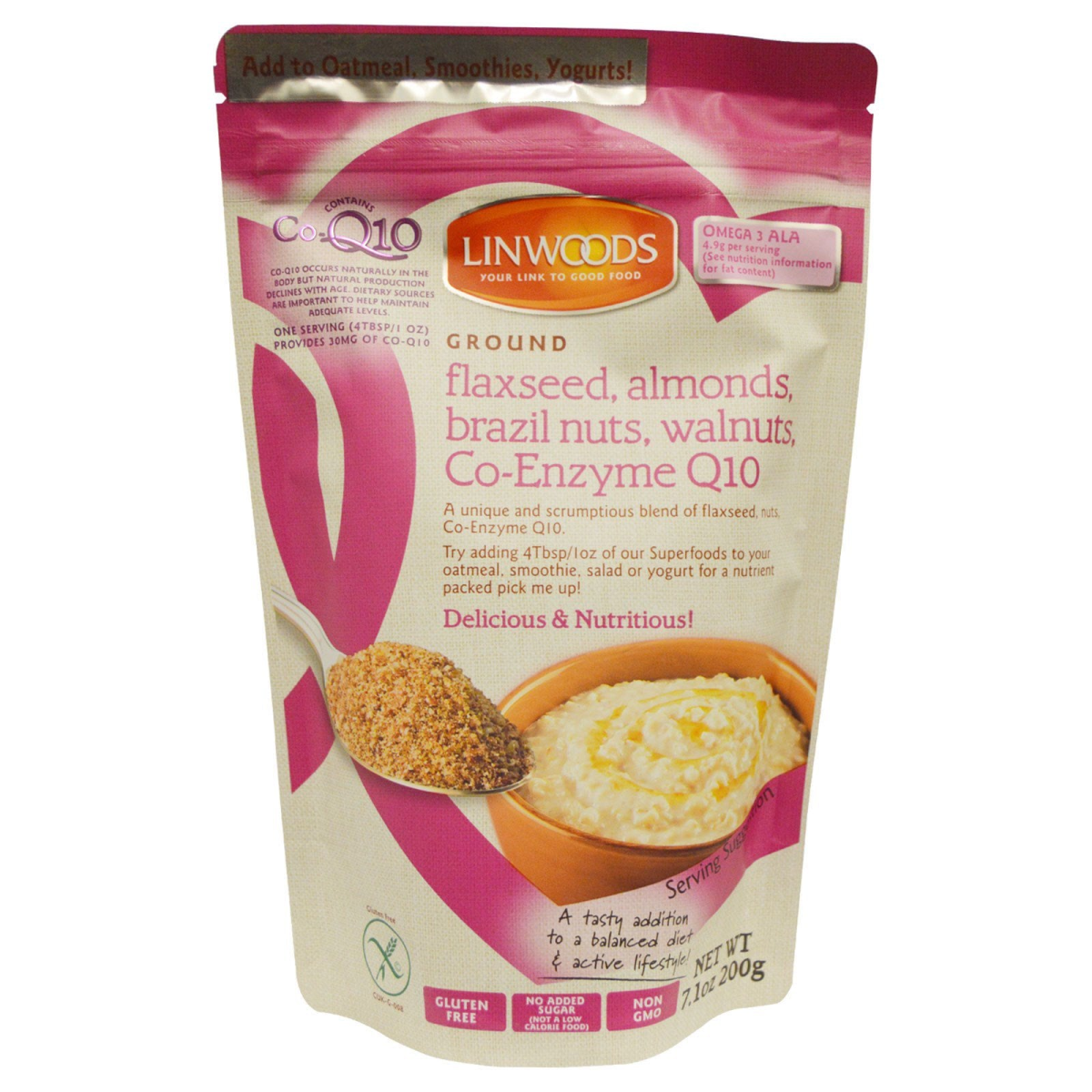 Add to Oatmeal, Smoothies, Yogurts Contains Co-Q10 Your Link to Good Food Omega 3 ALA 4.9g per Serving (See Nutrition Information for Fat Content) One Serving (4 TBSP/1 oz) Provides 30 mg of CO-Q10 Delicious & Nutritious! Gluten Free No Added Sugar (Not a Low Calorie Food) Non-GMO Suitable for a Vegan Diet Packaged in a Protective Atmosphere Co-Q10 occurs naturally in the body but natural production declines with age. Dietary sources are important to help main adequate levels. A unique and scrumptious blend of flaxseed, nuts, Co-Enzyme Q10. Try adding 4 Tbsp/1 oz of our superfoods to your oatmeal, smoothie, salad or yogurt for a nutrient packed pick me up! A tasty addition to a balanced diet & active lifestyle! We cold-grind our seeds and nuts for quick and easy absorption into the body. Healthy Benefits Include: Excellent Source of Selenium: Required for the normal function of the immune system and to provide protection of cells and tissues from oxidation. Excellent source of Magnesium: Beneficial for healthy bones and teeth and aids in proper muscle function, nervous system function and energy metabolism. Excellent source of Dietary Fiber: Helps maintain healthy bowel regularity. Superfood-A food that delivers a structural or functional health benefit
