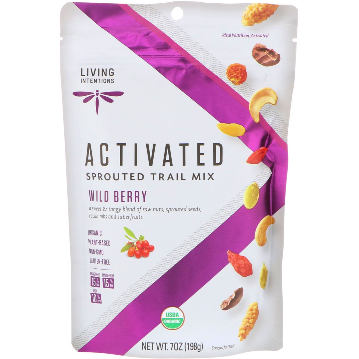 Ideal Nutrition, Activated Plant Based Non-GMO Gluten Free Manganese 15% DV Magnesium 15% DV Iron 10% DV USDA Organic Pure Food Ingredients, No Weird Stuff Added! Certified Kosher Paleo Certified Vegan Certified Organic by Oregon Tilth A sweet & tangy blend of raw nuts, sprouted seeds, cacao nibs and superfruits. Taste, Activated Try a new twist on trail mix! Our Wild Berry Trail Mix is an exotic blend of sweet & tangy berries, sprouted pumpkin seeds, raw cashews, a medley or raisins and cacao nibs. Whether you are hiking, biking, working or playing, our Sprouted Trail Mix offers a sustainable energy boost to charge you up throughout the day. Ideal Nutrition, Activated Sprouted Superfood Bio-Available Minimally Processed Live Enzymes What Is Activated? Activated is food at its highest potential. At Living Intentions, Activated is an outlook, a way of being, and a mantra for intentionally shifting life into higher gear. That's why we make incredibly flavorful snacks and meals with real, nutritionally-dense, activated foods.