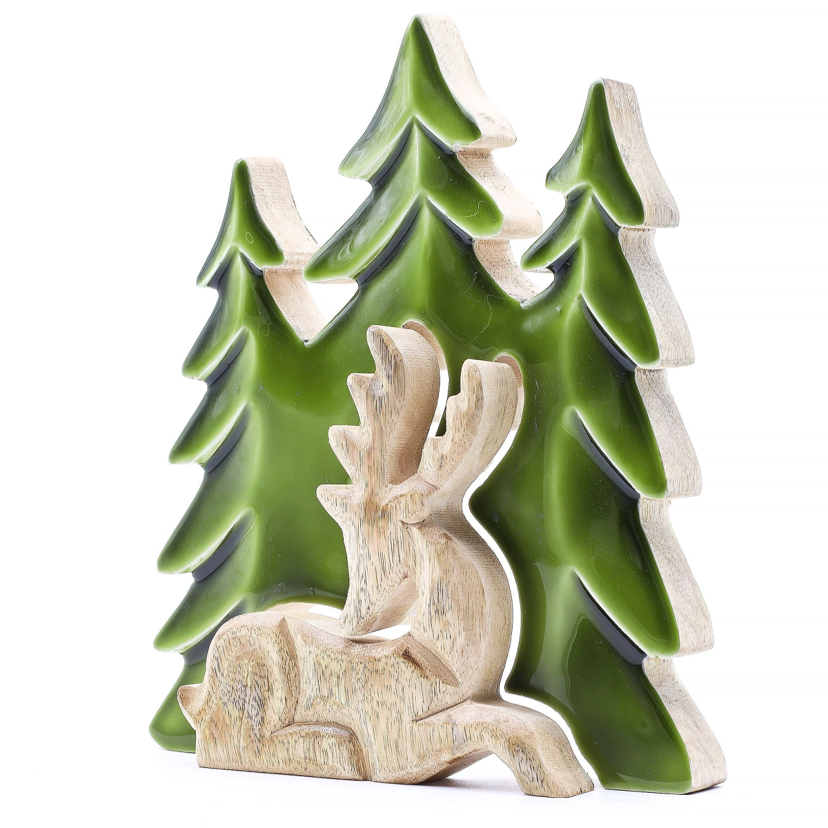 Bring a moment of woodland stillness to your displays with this elegant Stag in the Forest ornament. Carved from mango wood and finished with rich green enamel, this piece features a majestic stag peacefully resting under the shelter of three tall trees.