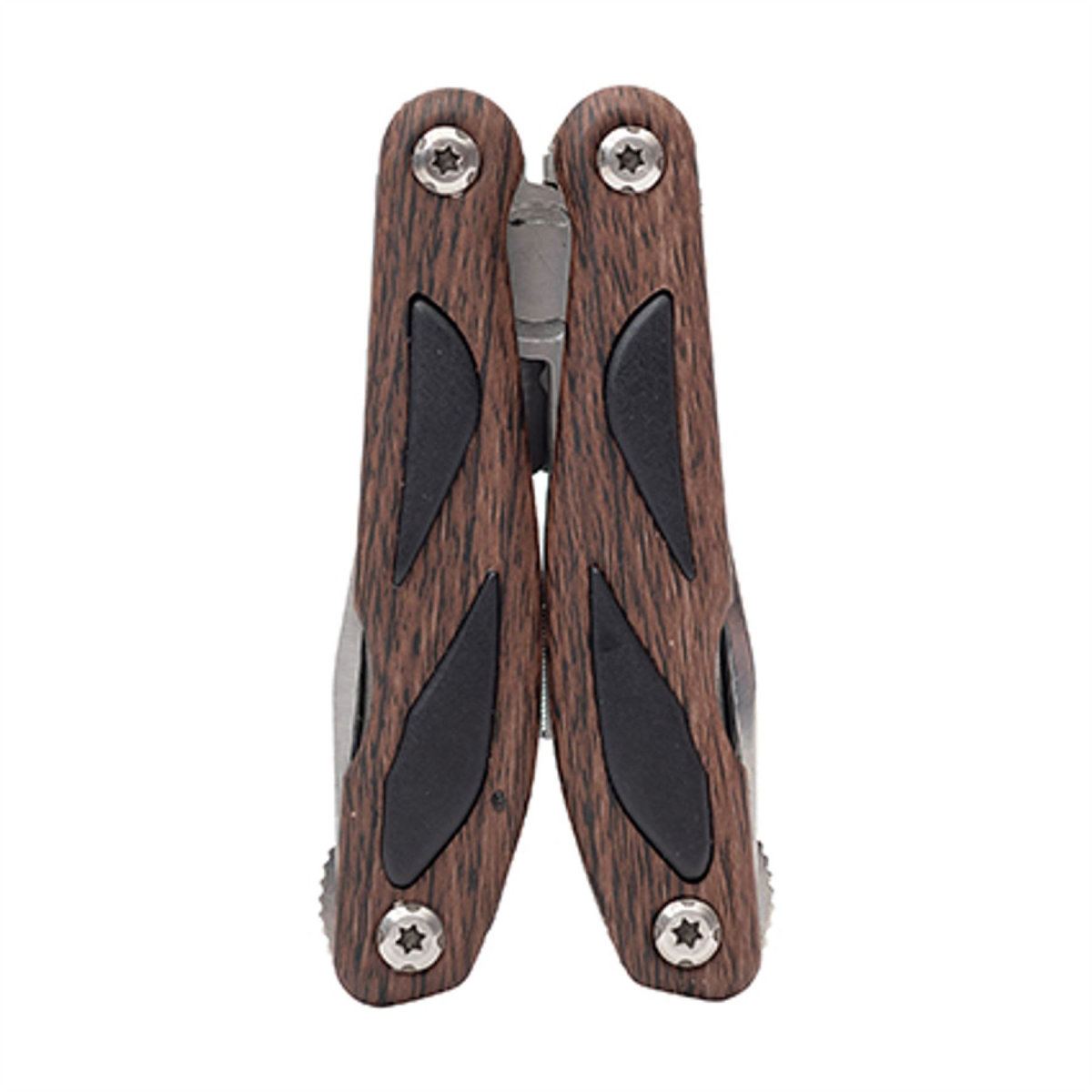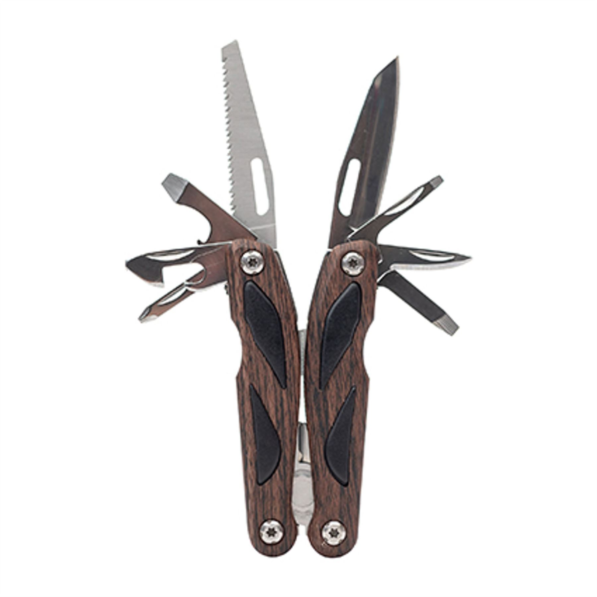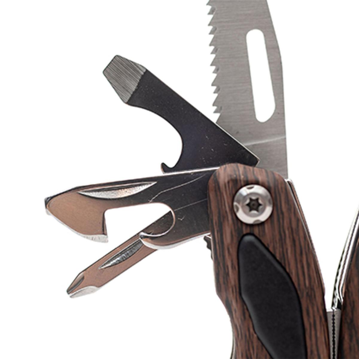 Phillips Screwdriver, Wire Cutters, 2 Flathead Screwdrivers, Bottle Opener, Can Opener, Small Knife, Saw Knife, Pliers
