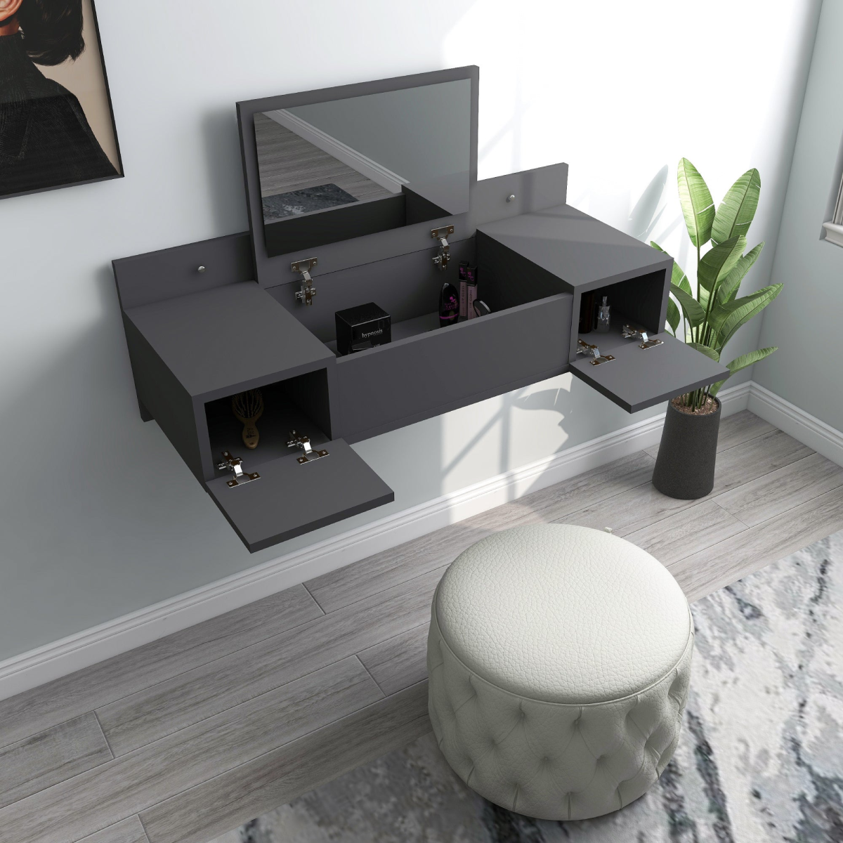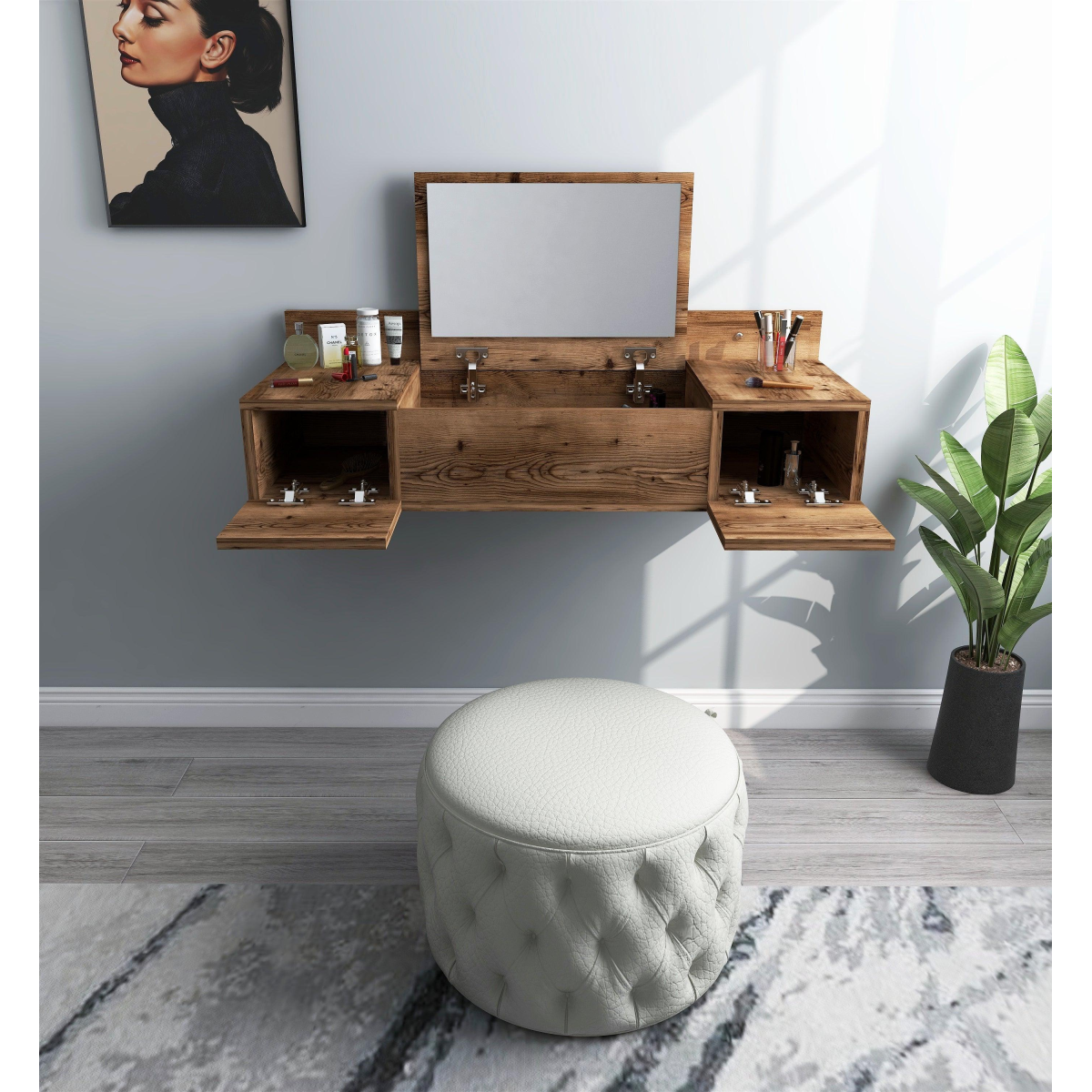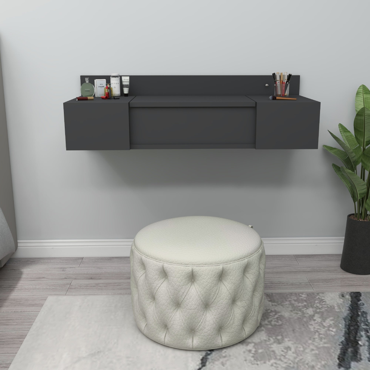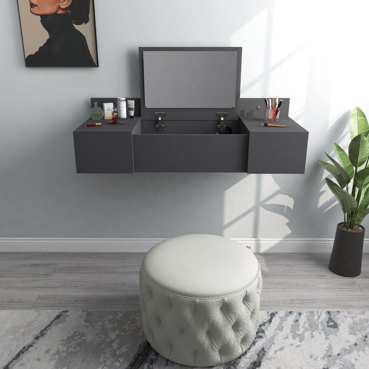 A makeup table, also known as a vanity table, is a piece of furniture typically used for applying makeup, grooming, and dressing. It is usually equipped with a mirror, a set of drawers or compartments for storing beauty products and personal accessories, and a comfortable seat. The design of the makeup table can vary widely, ranging from simple and minimalist to ornate and luxurious, depending on the style and preferences of the user. Some makeup tables come with built-in lighting, which helps to ensure accurate and flattering makeup application. Overall, a makeup table is a functional and stylish addition to any bedroom or dressing room. Bertus makeup table will give you easy access to your self-care items. It is wall-mounted and has multiple storage rooms plus an in-built mirror.