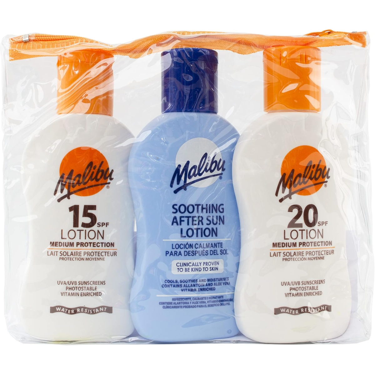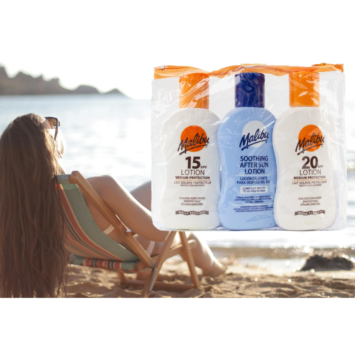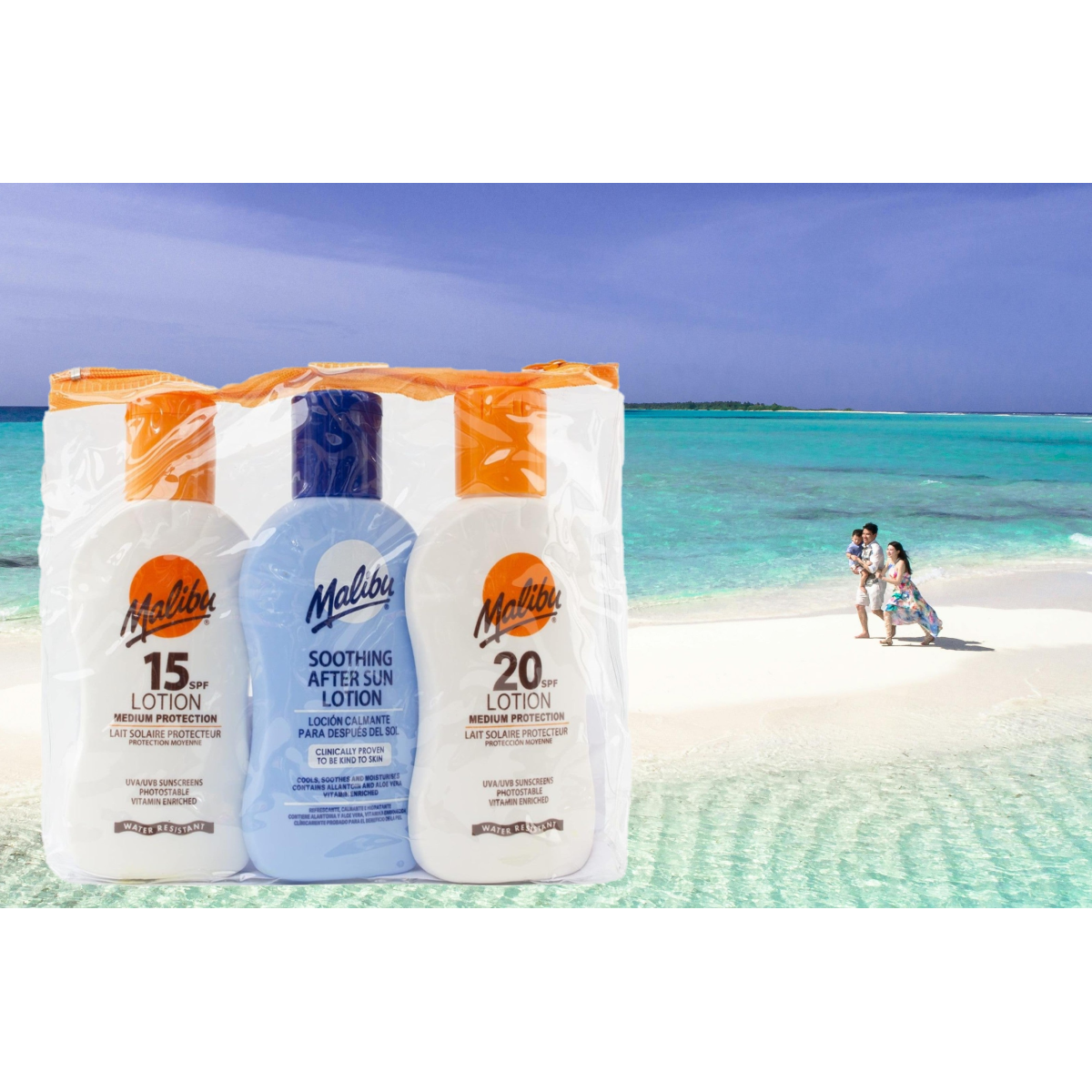 Protect and pamper your skin under the sun with the Malibu Sun Travel Essentials Multipack, a convenient set of three 100ml bottles featuring SPF 15 and SPF 20 sun creams and a soothing aloe vera after sun lotion. Perfect for holidays or sunny days out, this travel-friendly kit ensures your skin stays safe and hydrated.