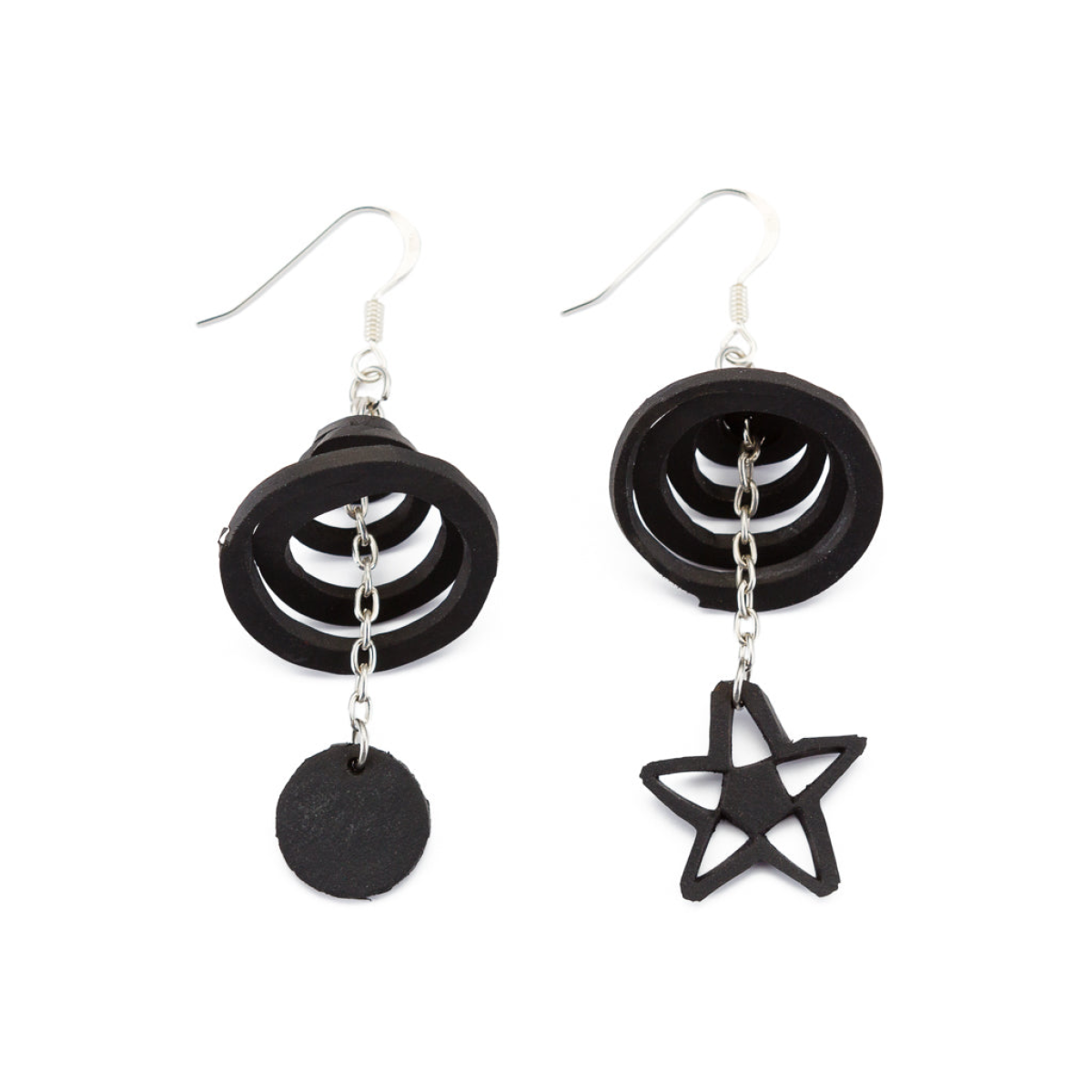 Men are from Mars; Women are from Venus. They are different, but make a perfect pair with their own uniqueness. Our Mars & Venus Unique Recycle Rubber Earrings come with an individual design for each earring in the pair. One is a star and the other is a circle.