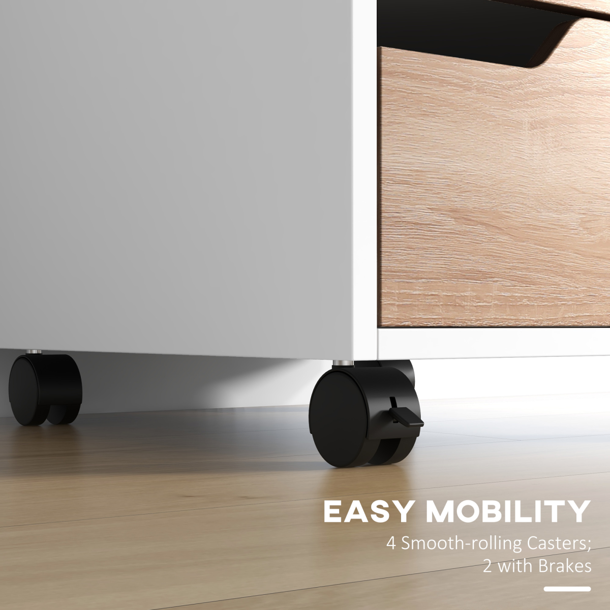 MDF Mobile File Cabinet w/ 3 Drawers Locking Wheels Metal Rails Oak Tone White
