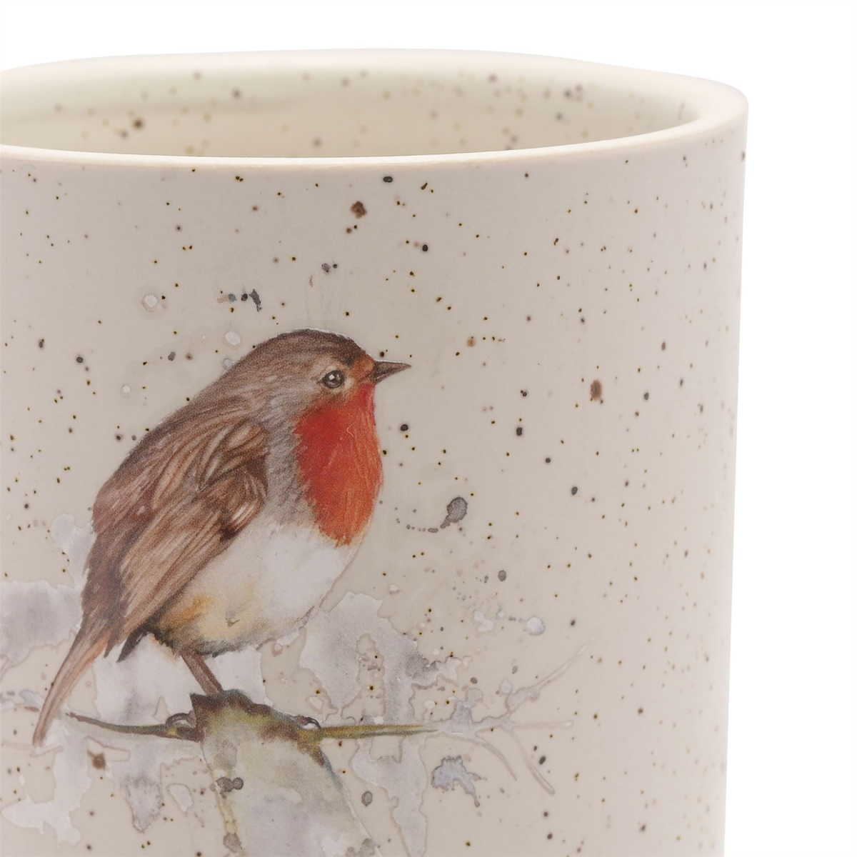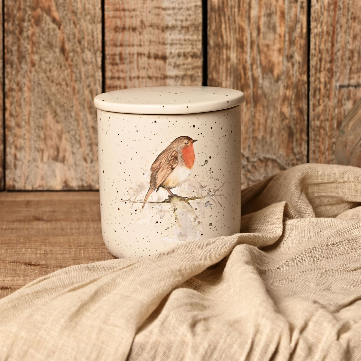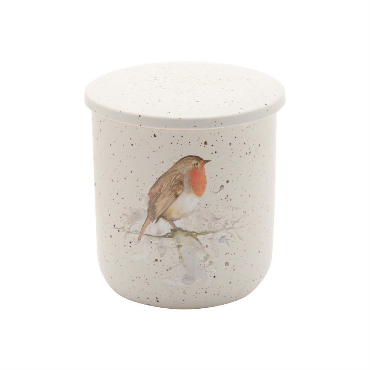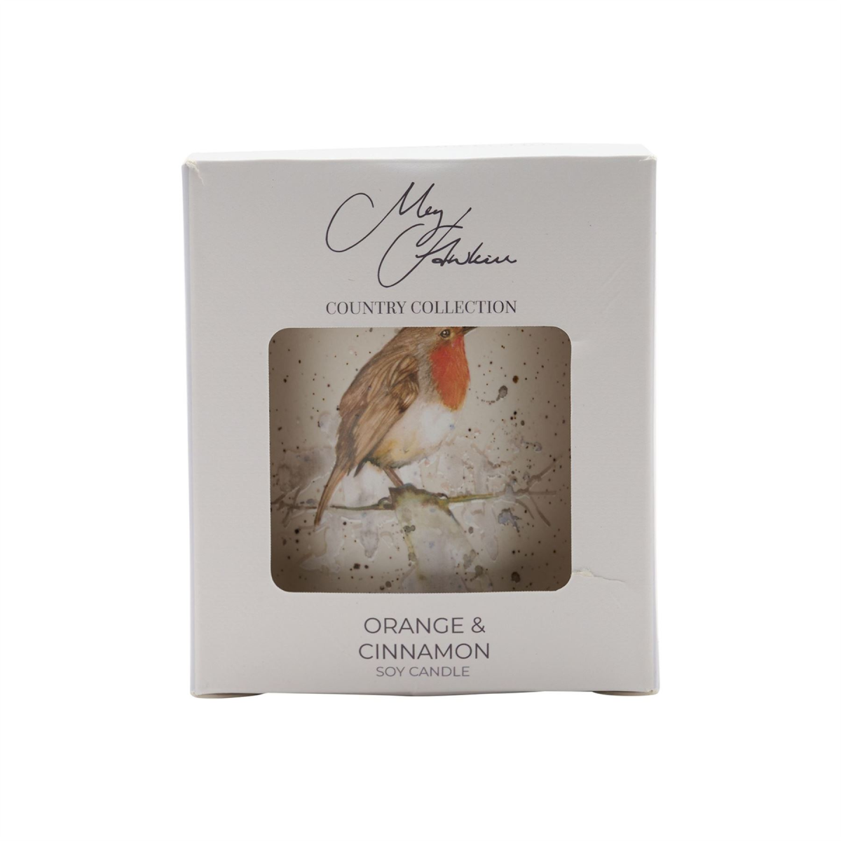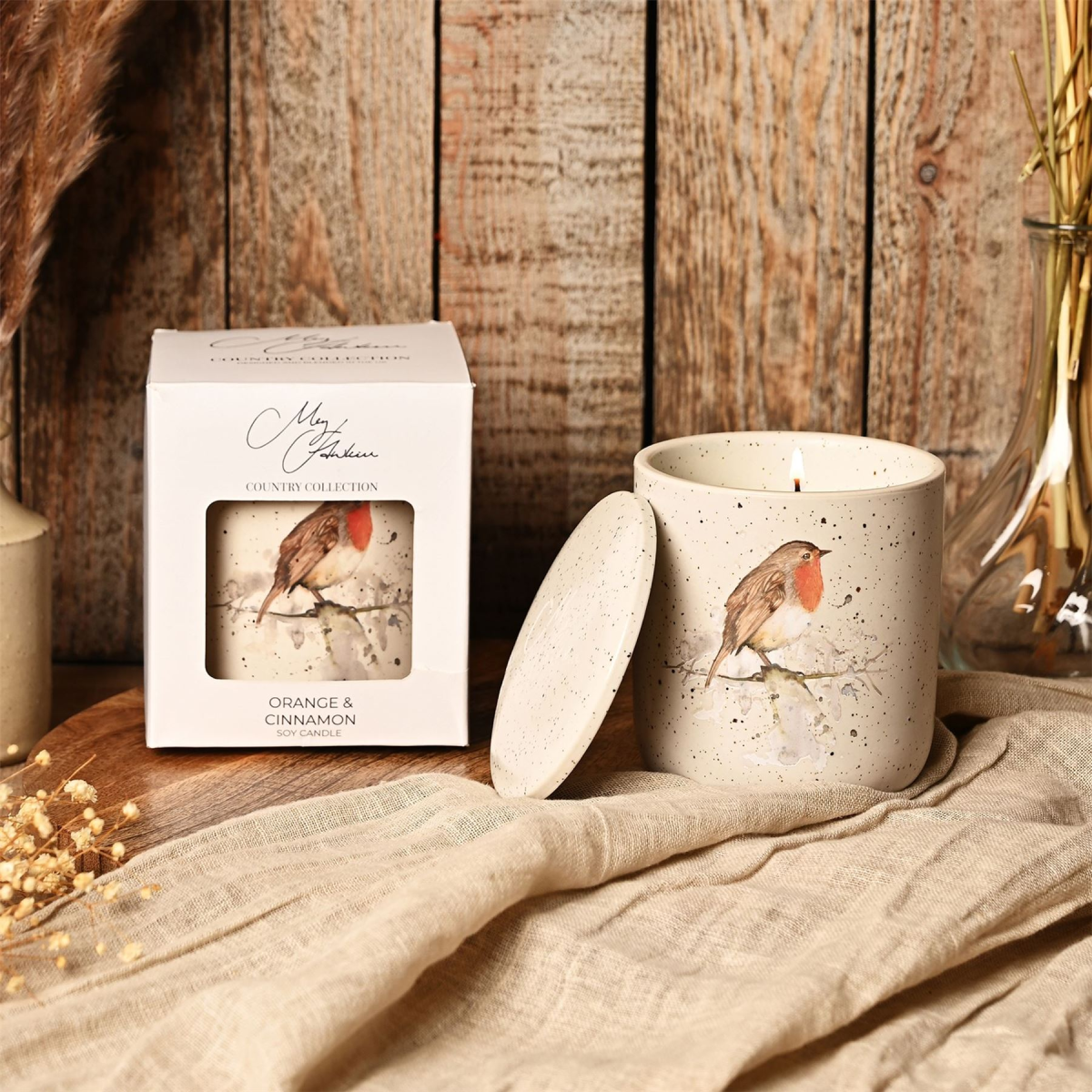 A Robin ceramic candle by MEG HAWKINS�. This decadent candle brings nature indoors with its enchanting fragrance. The ceramic candle holder showcases a white speckled finish, complete with printed robin illustration and matching Meg Hawkins signature lid. It houses a beautifully scented orange and cinnamon soy wax candle which boasts an impressive burn time of 42 hours. The candle is packaged in a window gift box.