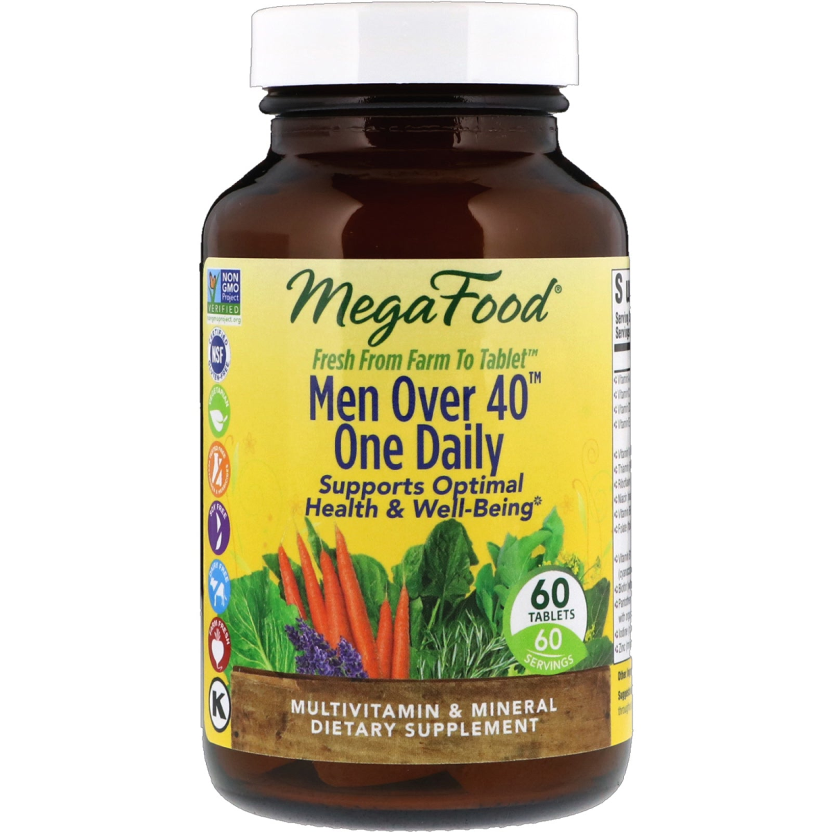 Glyphosate Residue Free* Non-GMO Project Verified NSF - Certified Gluten Free Vegetarian Tested Free of Pesticides & Herbicides Soy Free Dairy Free Farm Fresh Kosher Fresh From Farm To Tablet Supports Optimal Health & Well-Being 60 Servings Multivitamin & Mineral Dietary Supplement Iron Free Formula *Based on government limit of detection protocols.