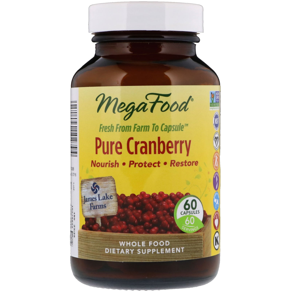 Fresh from Farm to Capsule Nourish • Protect • Restore 60 Servings James Lake Farms Whole Food Dietary Supplement Non GMO Project Verified NSF - Certified Gluten Free Certified Vegan Tested Free of Pesticides & Herbicides Soy Free Dairy Free Farm Fresh Kosher The Stauner Family of James Lake Farms John and Nora Stauner purchased the organic cranberry marsh in 2006 in beautiful northern Wisconsin. The Stauners and their three children grow 64 acres of certified organic cranberries with five different fruit varieties. MegaFood cares about doing things the right way - we refuse to take shortcuts, and we never compromise on quality or the things that matter. Since 1973, we have been going out of our way to source fresh and local foods from trusted farmers. We then make our wholesome supplements using our one-of-a-kind process to deliver the most authentic nutrition - much more than vitamins alone.